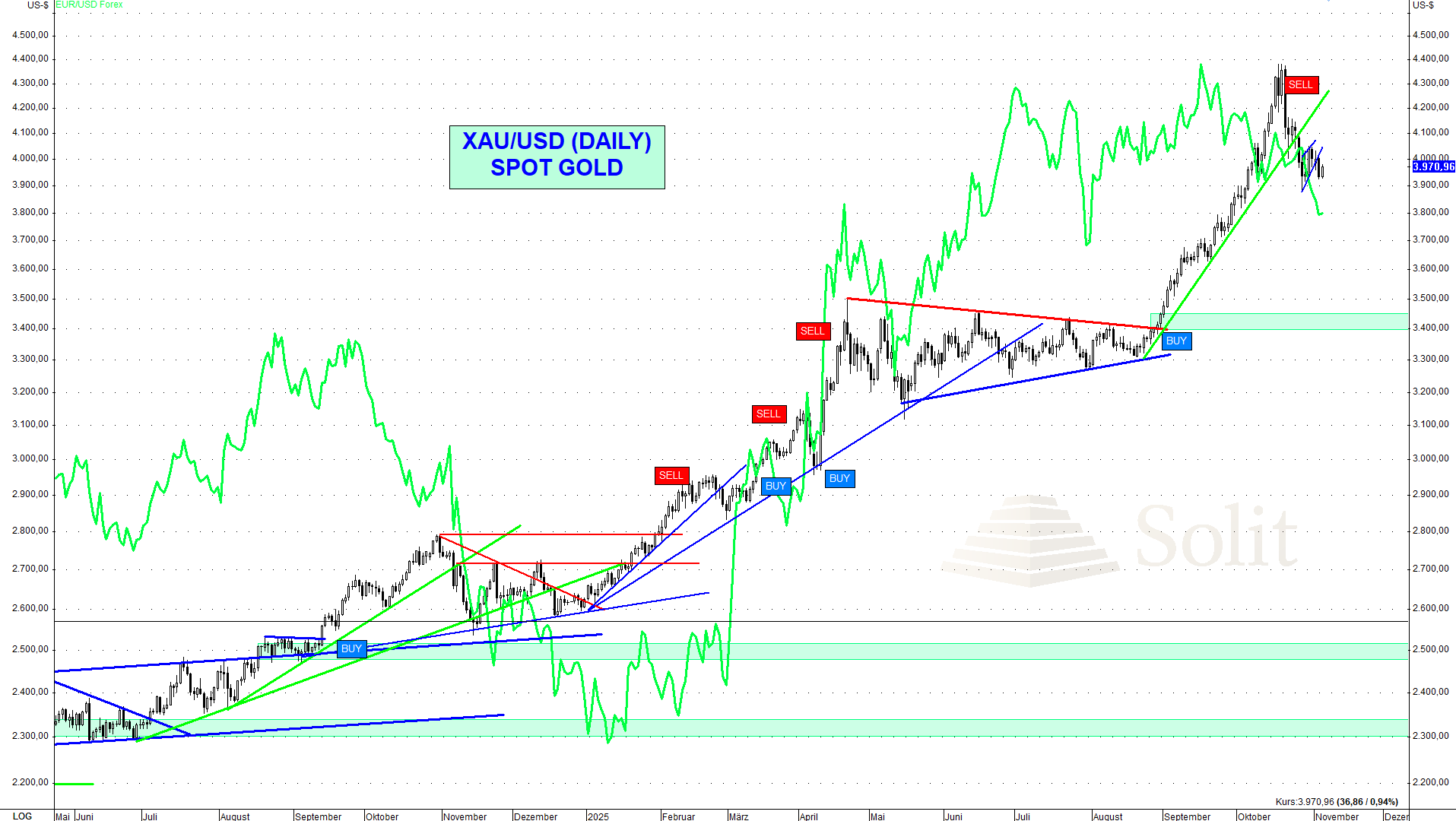 Der Goldpreis setzte seine Korrektur in dieser Woche fort und fiel am Dienstag auf ein Dreiwochentief von 3.886 $. Neben Gewinnmitnahmen nach der historischen Rallye in diesem Jahr...