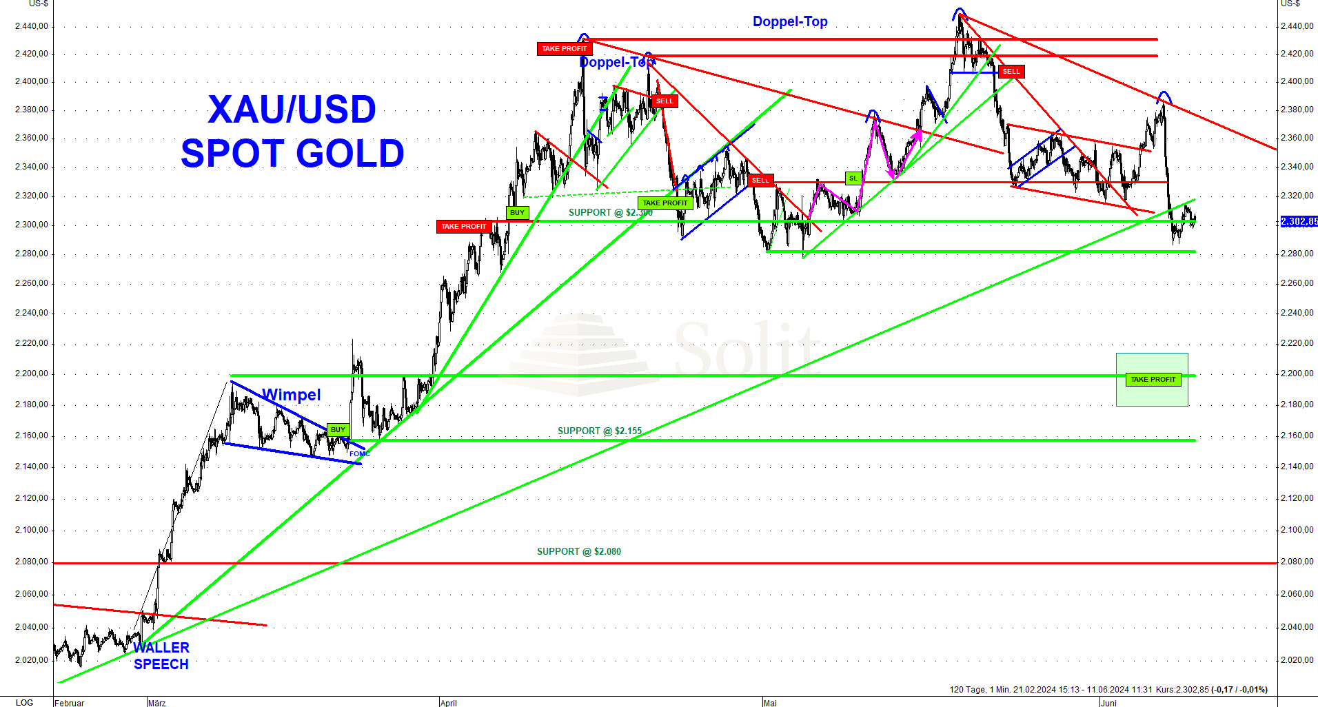 Am Freitagnachmittag zerstörten neue, sehr starke Arbeitsmarktdaten die Hoffnungen auf Zinssenkungen in den USA, ließen den US-Dollar stark ansteigen und führten zu weiteren Einbrüchen bei Gold- und Silberpreisen. Der Goldpreis hat mittlerweile die Unterstützung bei 2.280$ erreicht. Sollte diese Unterstützung in den kommenden Wochen brechen, so gäbe es weiteres Korrekturpotenzial bis 2.200$ je Feinunze.