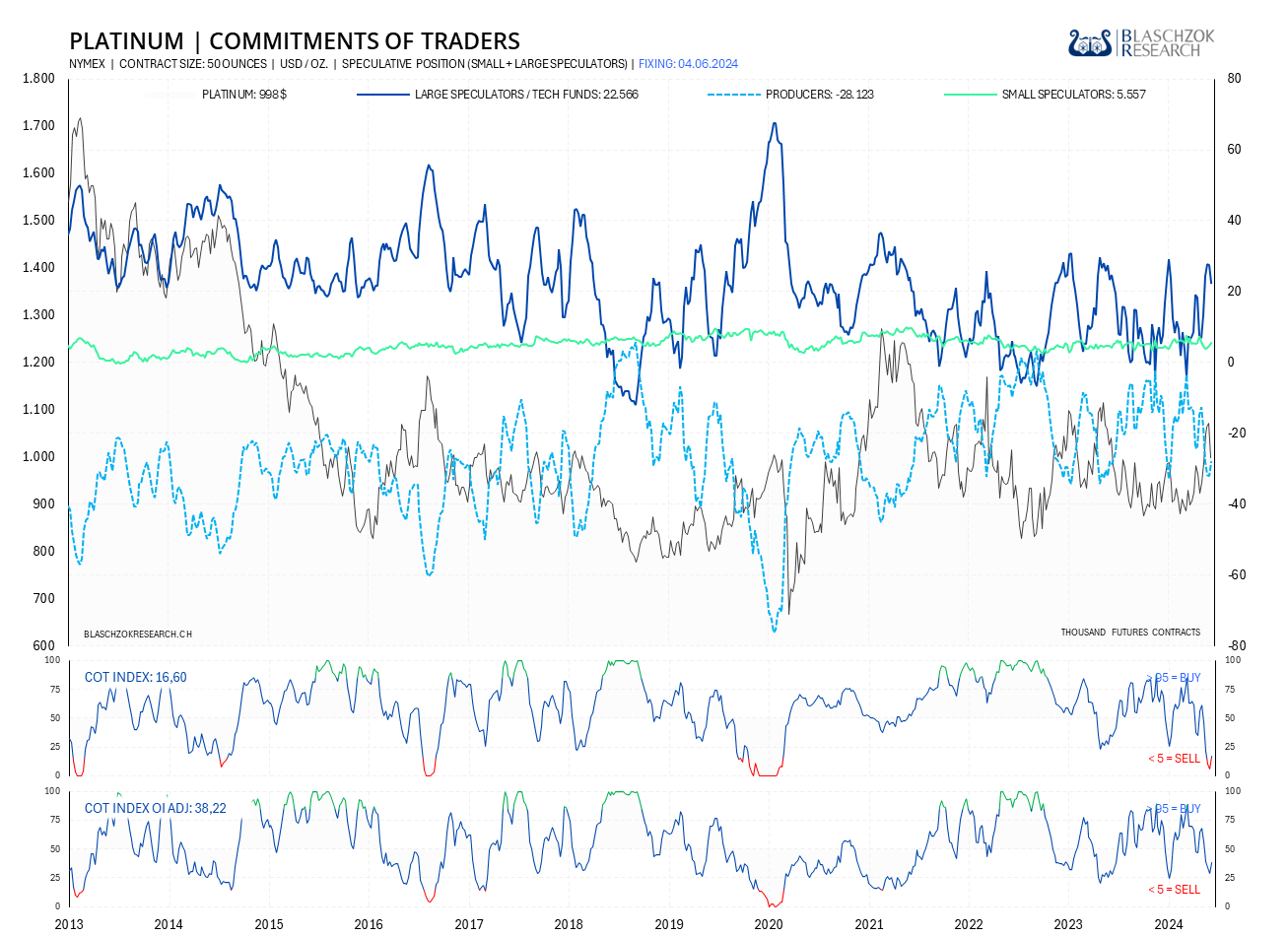 Der COT-Report wird immer freitags seitens der US-Terminmarktaufsicht (CFTC) veröffentlicht, wobei der Stichtag der Datenerhebung der Schlusskurs vom Dienstag ist. Die COT-Daten werden also immer mit einer Verzögerung von drei Tagen veröffentlicht. Premium Abonnenten von Blaschzok Research erhalten vor Handelsschluss am Freitag ein Blitzupdate mit Analysen zu Gold, Silber und Platin. Die COT-Daten ermöglichen einen Blick in die Zukunft, da sie einerseits ein Sentiment-Indikator sind und andererseits eine gute Einschätzung des Angebots und der Nachfrage am physischen Markt ermöglichen. Mit ihnen hat man einen Vorteil im Trading am Rohstoffmarkt.
