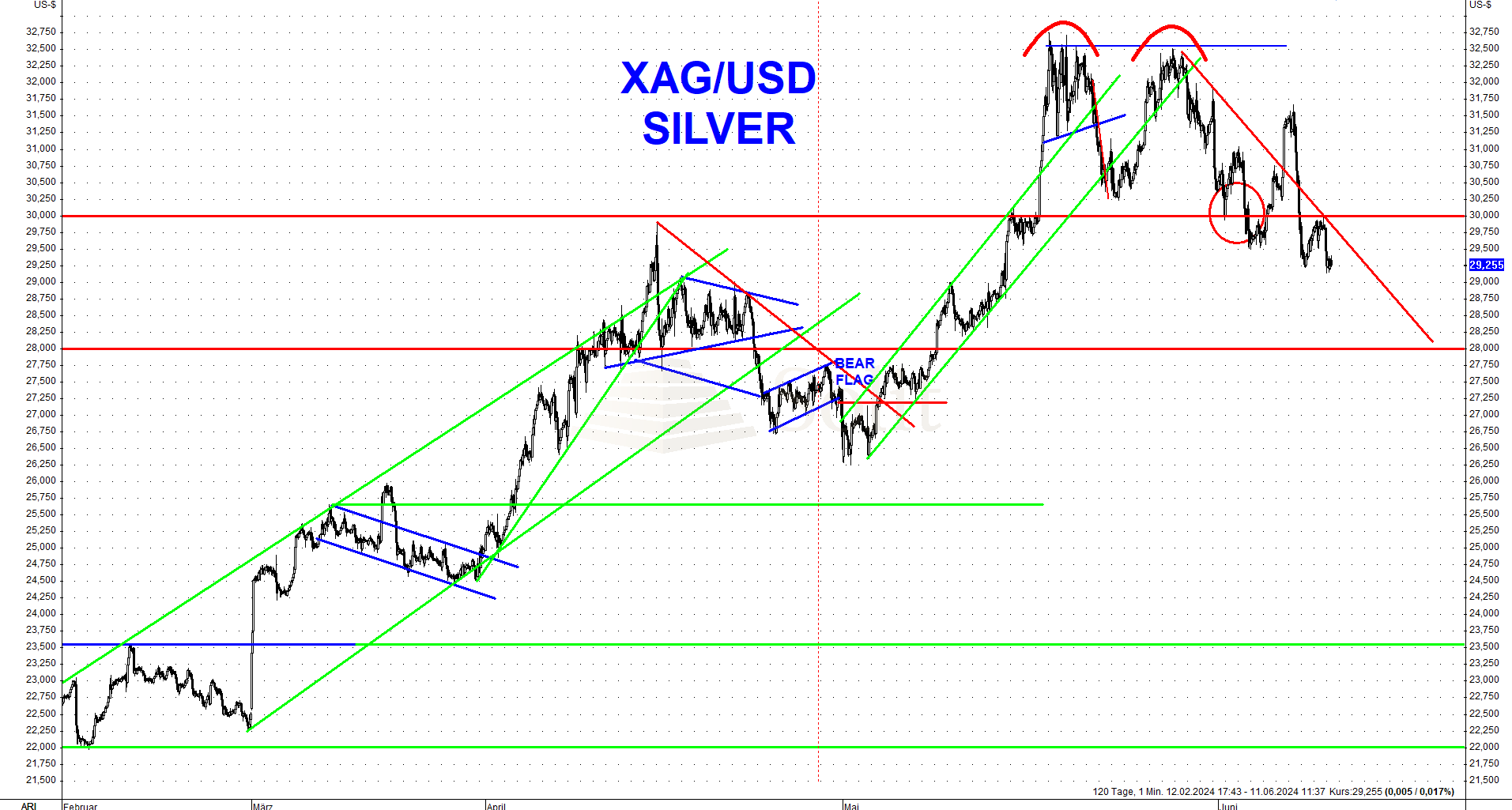 Die Arbeitsmarktdaten fielen am Freitag so gut aus und die Löhne waren so hoch, dass der Markt nun befürchtet, der September könnte für eine Zinssenkung der Fed zu früh sein, angesichts der bevorstehenden Wahlen in den USA. Der US-Dollar schoss daraufhin steil nach oben auf fast 105 Punkte im USD-Index, wogegen der Euro diametral gegensätzlich um einen US-Cent auf 1,08$ einbrach. Ich bleibe bärisch für den Euro und erwarte in den nächsten Wochen einen Test der Unterstützung bei 1,05$ und später im Jahr die Parität zum US-Dollar. Spätestens nach der frühen Zinssenkung der EZB fehlen jegliche fundamentalen Gründe für einen stärkeren Euro gegenüber dem US-Dollar. Investoren im Euroraum sollten daher weiterhin auf einen starken Goldpreis in Euro setzen.