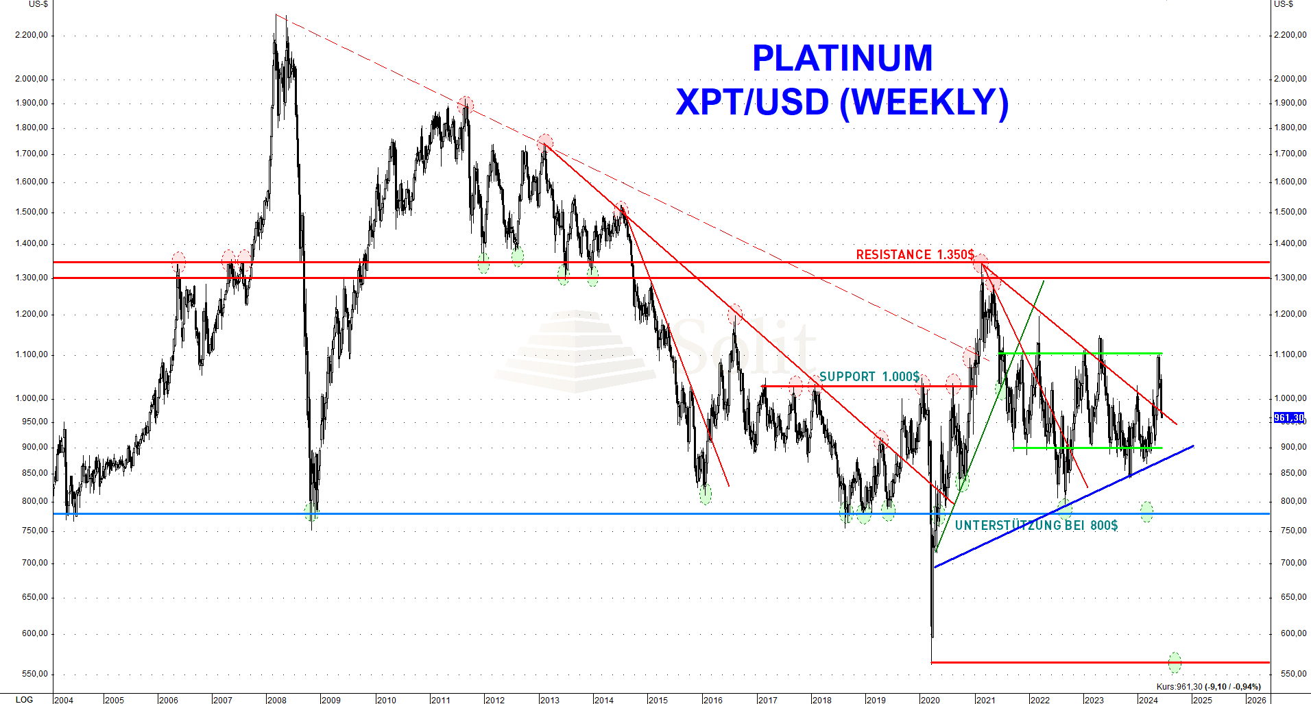 Man muss sich jedoch bewusst sein, dass der Platin- und Palladiumpreis während Rezessionen in der Vergangenheit kurzzeitig auch immer stark einbrach, weshalb eine Stop-Loss-Order der beste Freund kurzfristig agierender Trader ist. Ein panikartiger Einbruch auf nochmals 500$ wäre in einer Rezession oder einer neuen Krise mit einer Verkaufspanik an den Märkten durchaus denkbar.