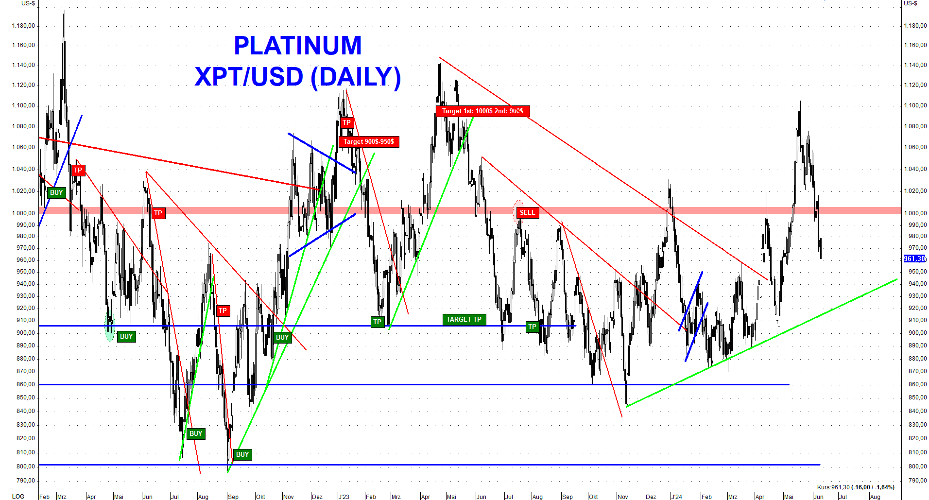 Der Platinpreis konnte im Zuge der Rallye am Goldmarkt auch kurzzeitig zulegen. Obwohl die Investmentnachfrage gestiegen war und vorübergehend Stärke im Markt zeigte, konnte sie den Platinmarkt nicht deutlich in ein Defizit bringen. Im Gegenteil hatten sich mit dem Anstieg über 1.100$ die Spekulanten am Terminmarkt schnell verausgabt. Ich hatte meinen Premium-Abonnenten in den wöchentlichen Analysen bei 970$ eine kurzzeitige Rallye bis 1.100$ prognostiziert, was eintraf, und dann im Bereich bei 1.070$ einen erneuten Preisrückgang auf 930$ prognostiziert, nachdem sich die COT-Daten schnell verschlechtert hatten.