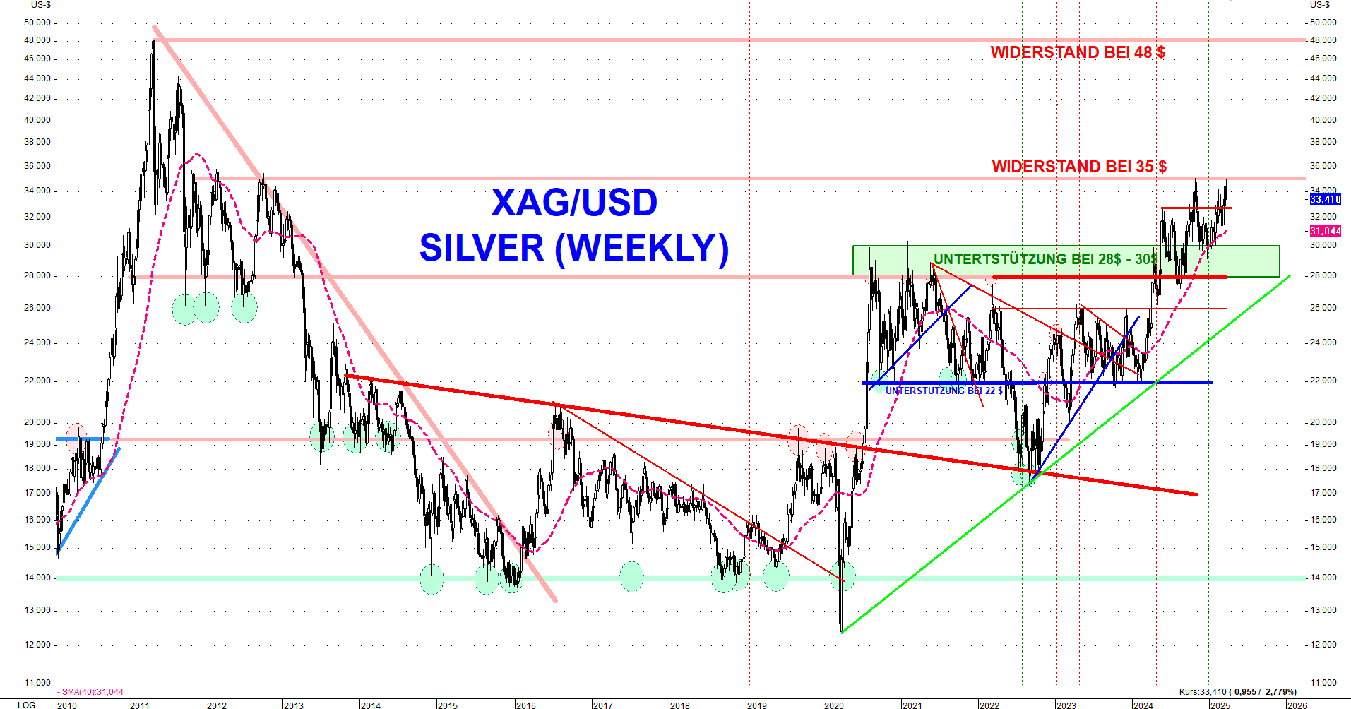 Ein solches Tief sollte jedoch als strategische Einstiegschance genutzt werden, um in Silber langfristig Long-Positionen aufzubauen.