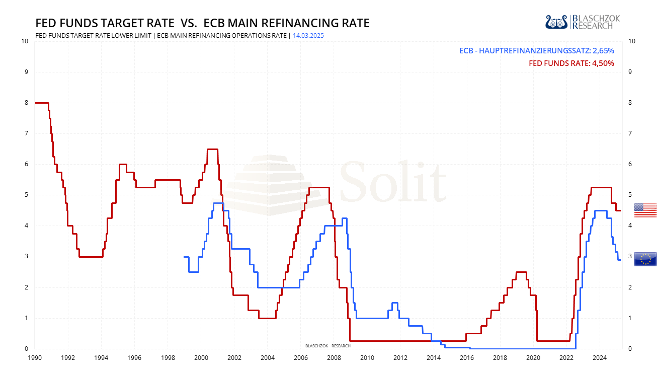 Der jüngste Anstieg des Goldpreises über die Marke von 3.000 US-Dollar wurde auch durch einen schwächeren US-Dollar begünstigt, der inzwischen sämtliche Gewinne seit der Wahl Donald Trumps wieder eingebüßt hat. Gleichzeitig nehmen die Sorgen über eine harte Landung der US-Wirtschaft in einem stagflationären Umfeld zu – ein Szenario, das dem Goldpreis ähnlich wie in den 1970er-Jahren besonders zuträglich ist. In einem solchen Umfeld dürfte die Investmentnachfrage nach Gold deutlich steigen, was sich in verstärkten Zuflüssen in Gold-ETFs widerspiegeln wird. Im weiteren Jahresverlauf wäre damit ein Anstieg des Goldpreises auf bis zu 3.500 US-Dollar denkbar. In den letzten beiden Monaten sind die US-Aktienmärkte gefallen, während der Goldpreis in die Höhe geschossen ist, was typisch ist für ein stagflationäres Umfeld, ähnlich wie in den siebziger Jahren.