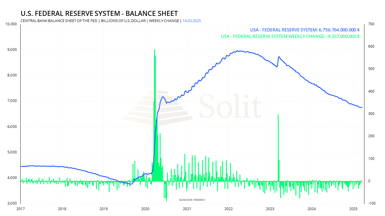 Der dovishte Punkt der Sitzung war die Ankündigung, das Tempo des Quantitative Tightening (QT) zu verlangsamen. Ab dem 1. April soll der Abbau der Fed-Bilanz erneut gedrosselt werden, indem die monatliche Reduzierung von US-Staatsanleihen von 25 Milliarden auf 5 Milliarden US-Dollar gesenkt wird. Ursprünglich betrug der Abbau 60 Milliarden US-Dollar pro Monat. Die meisten FOMC-Mitglieder sind der Meinung, dass die Liquiditätslage langsam schwierig wird. Dennoch wurde die Entscheidung mit breiter Unterstützung innerhalb der Fed getroffen.