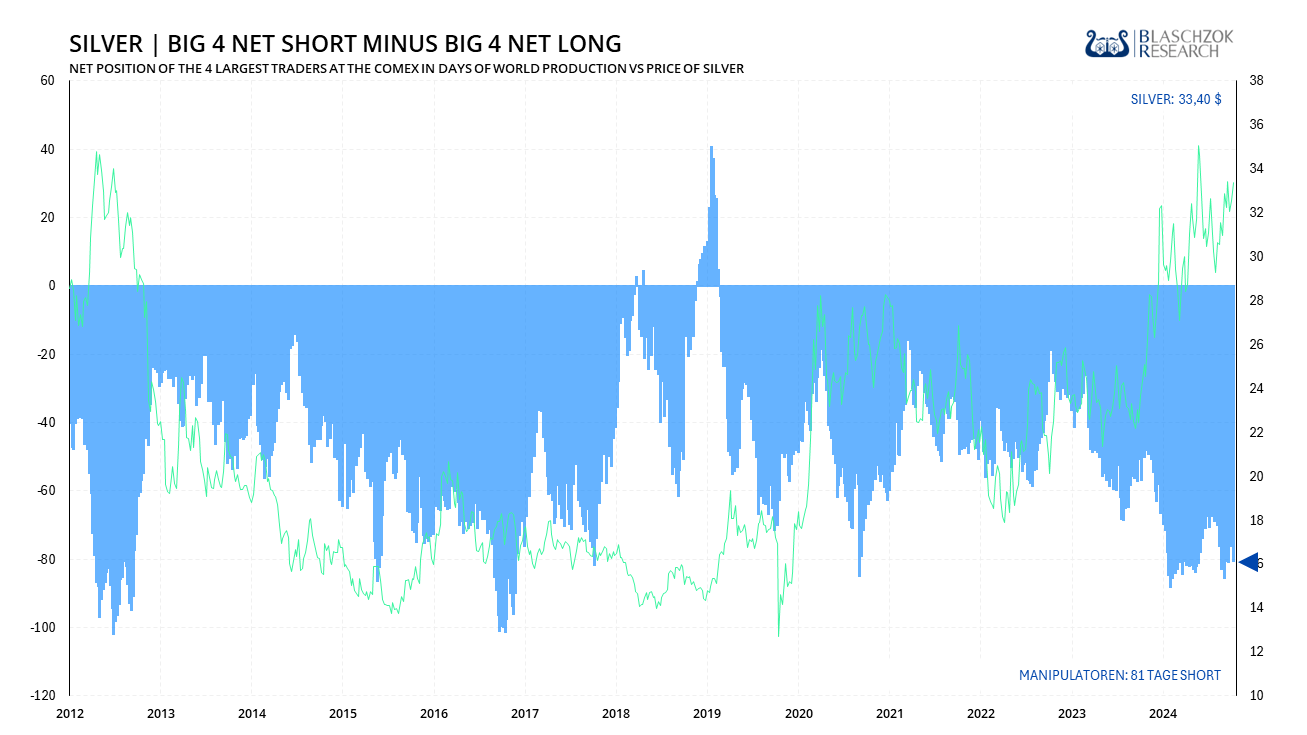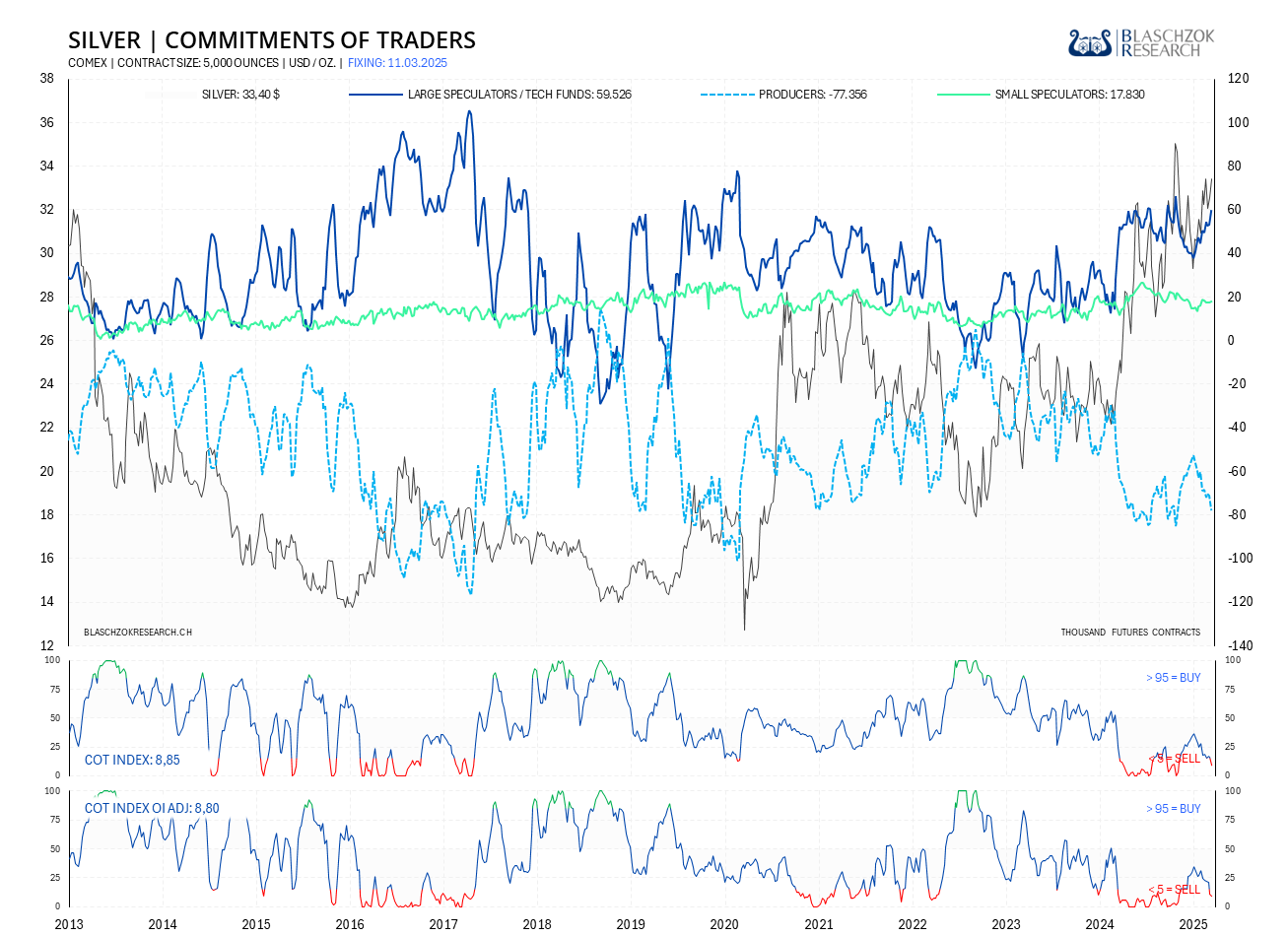 Das erklärt auch, warum der Silberpreis aktuell nur bei 34$ notiert bzw. am Widerstand bei 35$ festhängt. Entscheidend ist jetzt, ob der Goldpreis nur ein Abfischen über 3.000 $ erlebt und anschließend wieder darunter fällt oder ob er weiter steigen kann. Falls der Goldpreis weiter anzieht, könnte auch Silber weiter steigen, aber es gibt keinen Raum für einen Short-Squeeze am Terminmarkt.