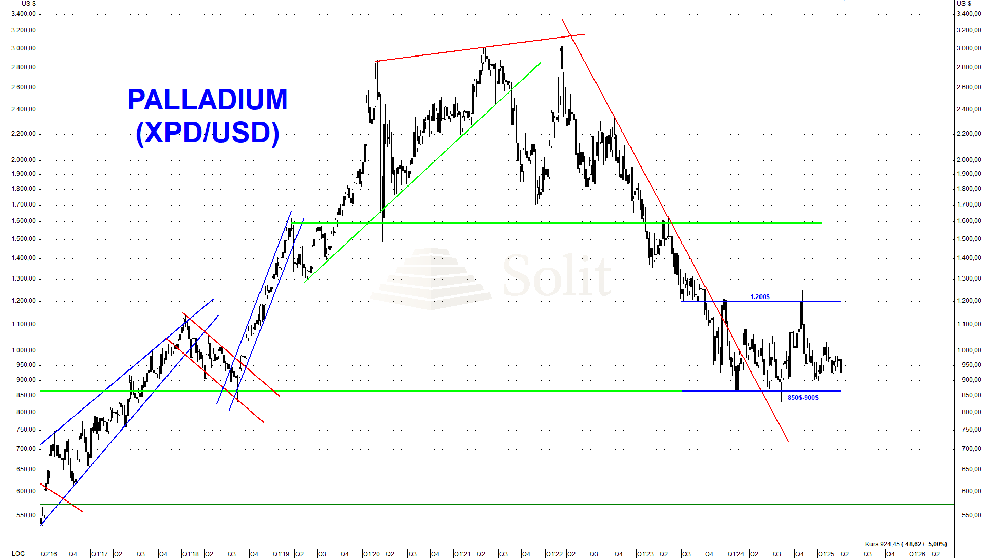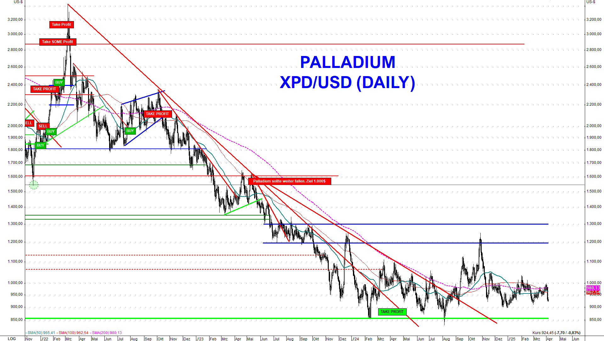 Zusätzlich stellt eine globale wirtschaftliche Abschwächung ein weiteres Risiko für den Palladiumpreis dar. Im Falle einer Rezession wäre ein kurzfristiger und markanter Rückgang unter die Unterstützungszone bei 850$ sehr wahrscheinlich. Die nächste technische Unterstützung befindet sich erst bei 570$. Auf diesem Niveau sehe ich aktuell eine attraktive Chance für einen kurz- bis mittelfristigen Einstieg in Palladium, wobei wir die Lage dort dann neu analysieren müssen.