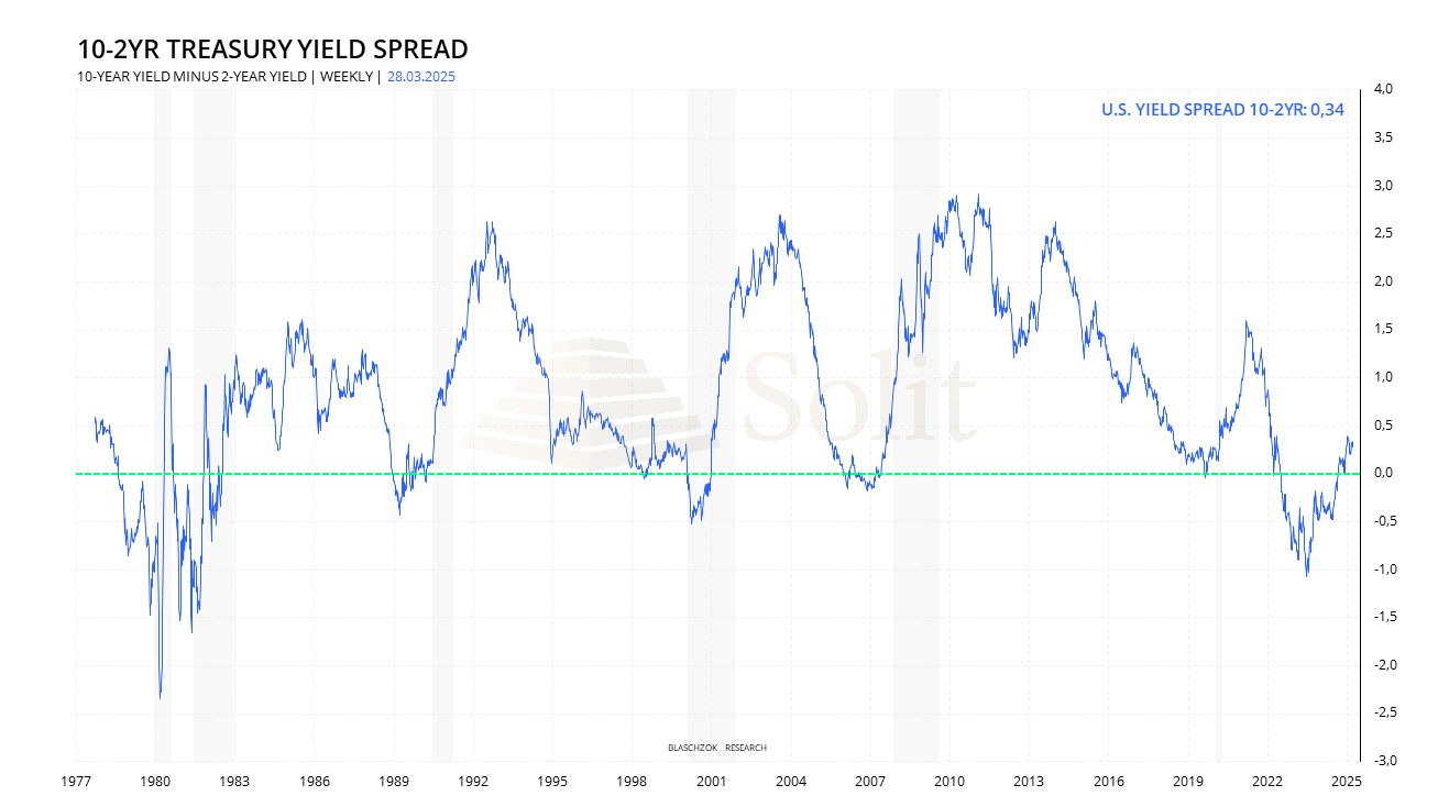 Der Verlauf der Zinsdifferenz zwischen 10- und 2-jährigen US-Staatsanleihen – ein bewährter Rezessionsindikator – warnt bereits seit geraumer Zeit vor einem bevorstehenden wirtschaftlichen Abschwung. Eine sogenannte Inversion, bei der die kurzfristigen Renditen über den langfristigen liegen, gilt seit Jahrzehnten als zuverlässiges Vorzeichen für eine Rezession. Nach einer historisch tiefen Inversion von unter –1 % im Jahr 2023 hat sich der Spread zuletzt wieder leicht ins Positive gedreht und liegt aktuell bei +0,34 % (Stand: 28.03.2025).