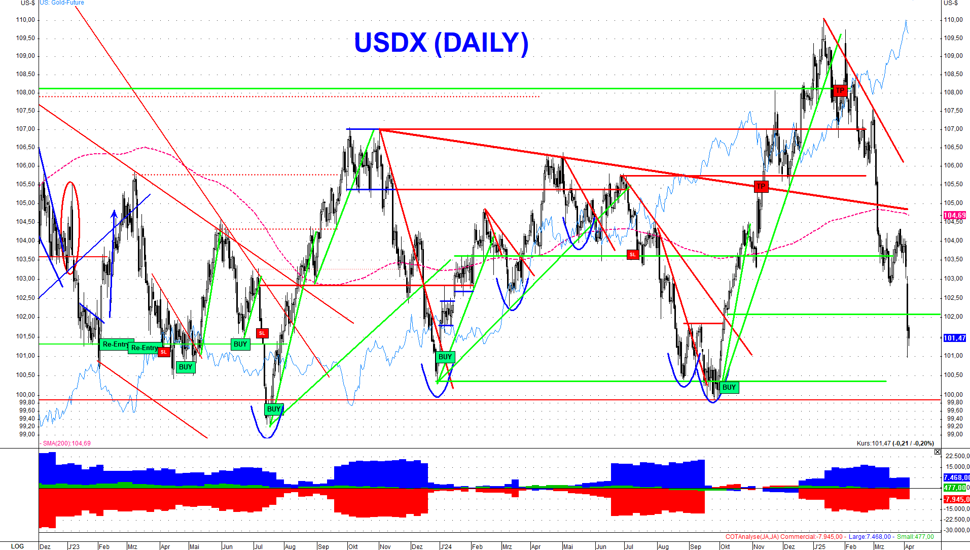 Auch der Aktienmarkt litt unter der Eintrübung der globalen Wirtschaftsaussichten. Der US-Leitindex S&P 500 verlor gegenüber seinem Hoch Mitte Februar 12,5%, während die Technologiebörse Nasdaq 100 sogar auf einem Minus von über 17 % sitzt. Der Goldpreis konnte nach der Ankündigung der Zölle zwar auf ein neues Allzeithoch bei 2.167$ ansteigen, crashte danach jedoch kurzzeitig auf 3.055$ je Feinunze, während sich die Flucht in US-Staatsanleihen in dieser Woche fortsetzte. Die zweijährigen US-Staatsanleihen stiegen sogar auf den höchsten Stand seit zwei Jahren, während die Zinsen diametral gegensätzlich sanken. Der Euro stieg am gestrigen Tag sprunghaft auf 1,115 $ an, während der US-Dollar-Index auf 101 Punkte fiel – der tiefste Stand seit einem halben Jahr.