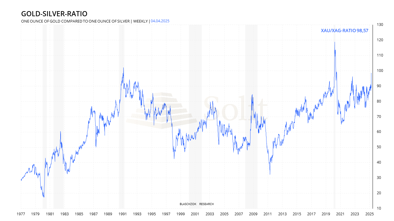 Während Silber zuletzt lediglich das Hoch von vor sechs Monaten bei rund 35$ erneut anlaufen konnte, legte der Goldpreis im gleichen Zeitraum um etwa 16% zu. Mit dem jüngsten Preisrutsch stieg das Gold-Silber-Ratio auf 98, ein Niveau, das in der Vergangenheit nur zweimal erreicht wurde: während des Corona-Crashs 2020 und im Jahr 1991.