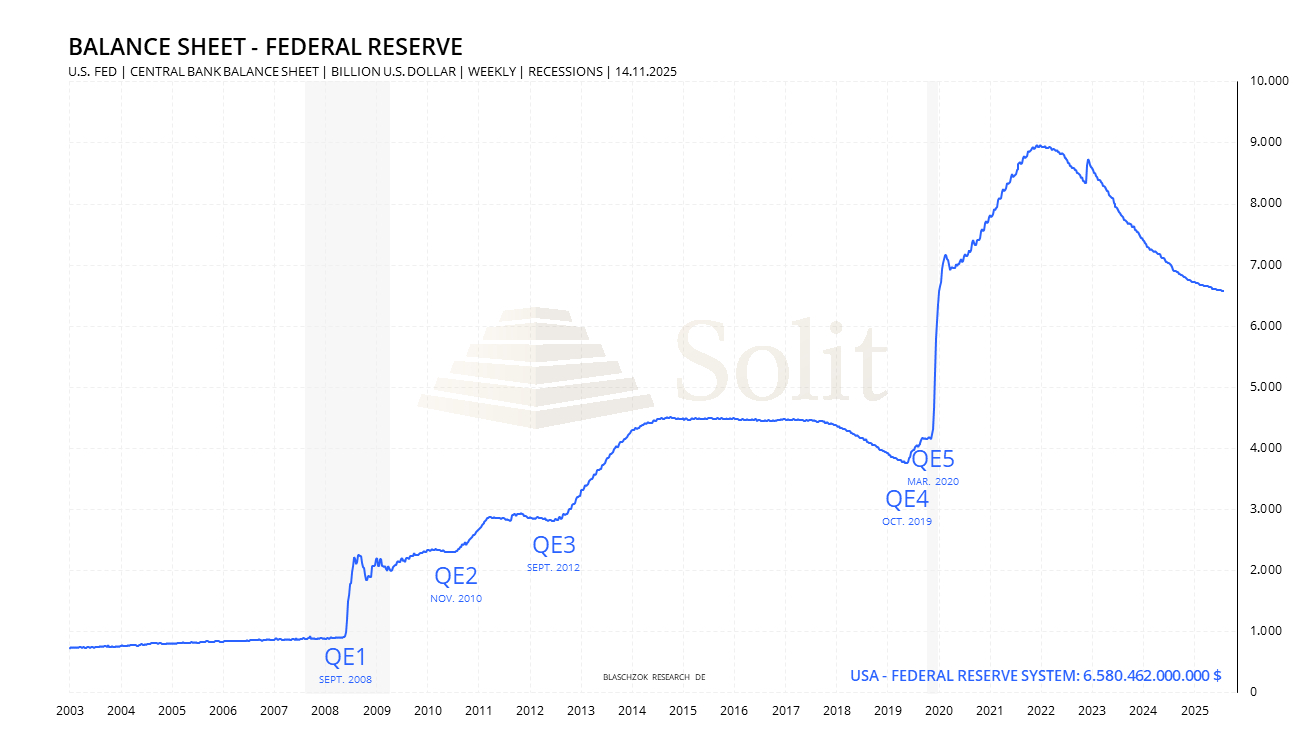 Vor 2008 war der private Markt und nicht die Fed die wichtigste Quelle für Liquidität. Seither hat sich die Fed vom Kreditgeber der letzten Instanz zur mit Abstand wichtigsten Quelle für Systemliquidität gewandelt. Folgende Grafik zeigt die Bilanzsumme der Fed seit 2003. Vor 2008 wuchs diese langsam und stetig um 4 % pro Jahr, was in etwa dem Wirtschaftswachstum entsprach. Nach 2008 stieg die Bilanzsumme durch die QE-Programme sprunghaft an, sodass auch die Bankreserven erstmals stark anstiegen. Es zeigt sich immer das gleiche Muster einer Ruhe vor einer neuen Krise. Das QT-Programm hat dem System in den letzten vier Jahren wieder 27% der Liquidität entzogen, sodass eine neue Rezession bereits in Sichtweite liegt. Es entsteht sukzessive deflationärer Druck und die Bankreserven beginnen zu sinken. Lässt man eine Rezession und einen Aktien-Bärenmarkt zu oder verhindert man mit neuer Liquidität ein Platzen der Blase?