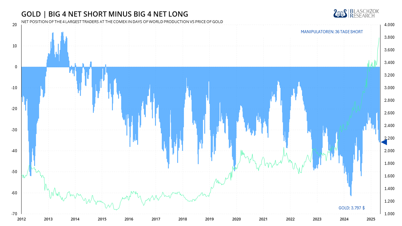 Interessant ist, dass die großen vier Händler am Terminmarkt im letzten Monat ihre Shortposition deutlich ausgeweitet haben – von 21 auf 36 Tage der Weltproduktion. Es scheint, dass man im Bereich um 4.000 $ ein zyklisches Hoch erwartet und dagegen wettet. Sollten die COT-Daten weiterhin Stärke zeigen, muss man davon ausgehen, dass nach einer Konsolidierung auf diesem hohen Niveau über Wochen oder Monate ein weiterer Preisanstieg folgen könnte. Kurzfristig dürfte jedoch bei 4.000 $ zunächst ein Deckel drauf sein und der Goldpreis eher seitwärts handeln - auch wenn dieser COT-Report noch Stärke zeigt. Das Potenzial für einen Long-Drop am Terminmarkt, der für eine stärkere Preiskorrektur sorgt, ist unvermindert gegeben, auch wenn die Daten besser sind als noch vor einem Jahr.