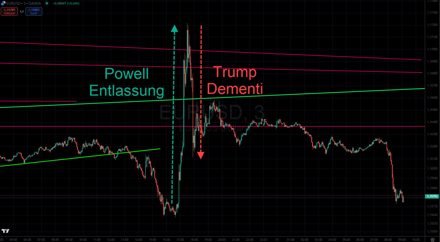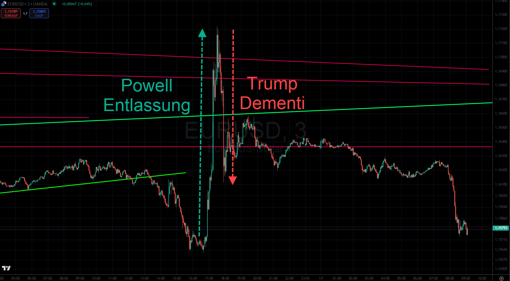 Neuerliche Spekulationen um einen Rauswurf Powells führten gestern Abend zu erheblichen Marktverwerfungen. Medienberichte von CBS, Bloomberg und der New York Times zufolge soll Trump bereits ein Entlassungsschreiben vorbereitet und sich politische Unterstützung bei republikanischen Abgeordneten gesichert haben. Unmittelbar danach dementierte Trump öffentlich unverzüglich diese Gerüchte.