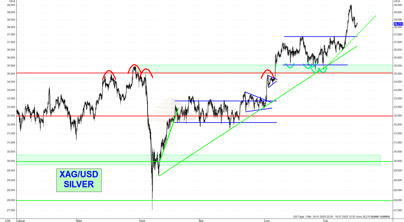 Gleichzeitig ist der Terminmarkt für Silber jedoch spekulativ stark überdehnt, was die Gefahr eines abrupten Endes der Rallye und einer folgend starken Korrektur birgt. Exogene Faktoren wie neue US-Zölle, ein stärkerer US-Dollar oder eine Korrektur beim Goldpreis könnten die Aufwärtsbewegung ebenfalls ausbremsen. Anleger sollten daher Stop-Loss-Orders platzieren und diese sukzessive nachziehen, um im Fall einer Korrektur antizyklisch kaufen zu können. Die Rallye verläuft aktuell entlang einer Klippe – das Momentum und der Aufwärtstrend sind intakt, doch das Risiko steigt.