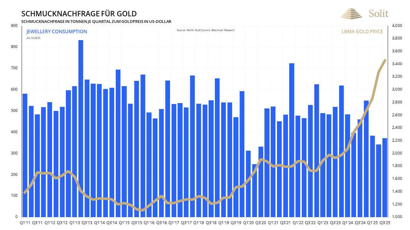Die Käufe der Zentralbanken lagen mit 220 Tonnen erneut auf einem hohen Niveau und damit rund 28 % über dem Vorquartal. Seit Jahresbeginn summieren sich die Käufe jedoch auf 634 Tonnen und liegen damit unter dem Volumen der ersten drei Quartale des Vorjahres, das bei 724 Tonnen lag. Für das Gesamtjahr 2025 wird eine um etwa 20 % geringere Nachfrage seitens der Zentralbanken und anderer Institutionen erwartet als im Durchschnitt der vergangenen drei Jahre.