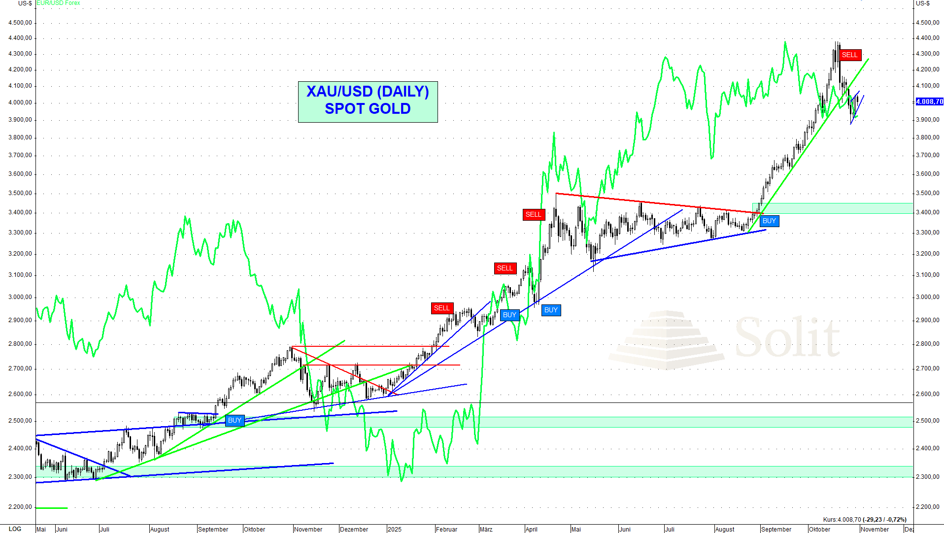Die Federal Reserve hatte am Mittwochabend die Zinsen den Markterwartungen entsprechend um 25 Basispunkte gesenkt. US-Notenbankchef Jerome Powell zeigte sich in seiner anschließenden Pressekonferenz jedoch unerwartet hawkish und sagte, eine weitere Zinssenkung im Dezember sei „keineswegs ausgemachte Sache, ganz im Gegenteil“. Dies drückte den Goldpreis erneut auf 3.919 $, bevor Schnäppchenjäger am Donnerstag die Gelegenheit nutzten und die Notierung wieder über die Marke von 4.000 $ trieben, in der Hoffnung die Rallye wird sich in Bälde fortsetzen.