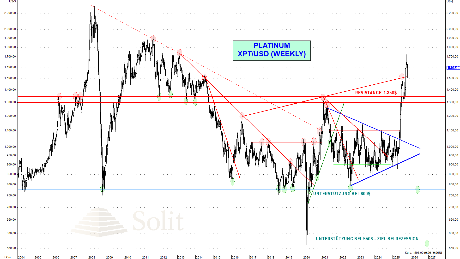 Sollte der Goldpreis in der nächsten Woche weiter korrigieren und in den Folgewochen weiter fallen, so wäre ein Rücksetzer bei Platin auf 1.350 $ wahrscheinlich. Mittelfristig erwarte ich, dass der Platinpreis wieder deutlich unter Verkaufsdruck gerät, insbesondere in einer Rezession oder Krise. Für Trader bietet die gestiegene Volatilität viele Chancen und gute Profitmöglichkeiten.