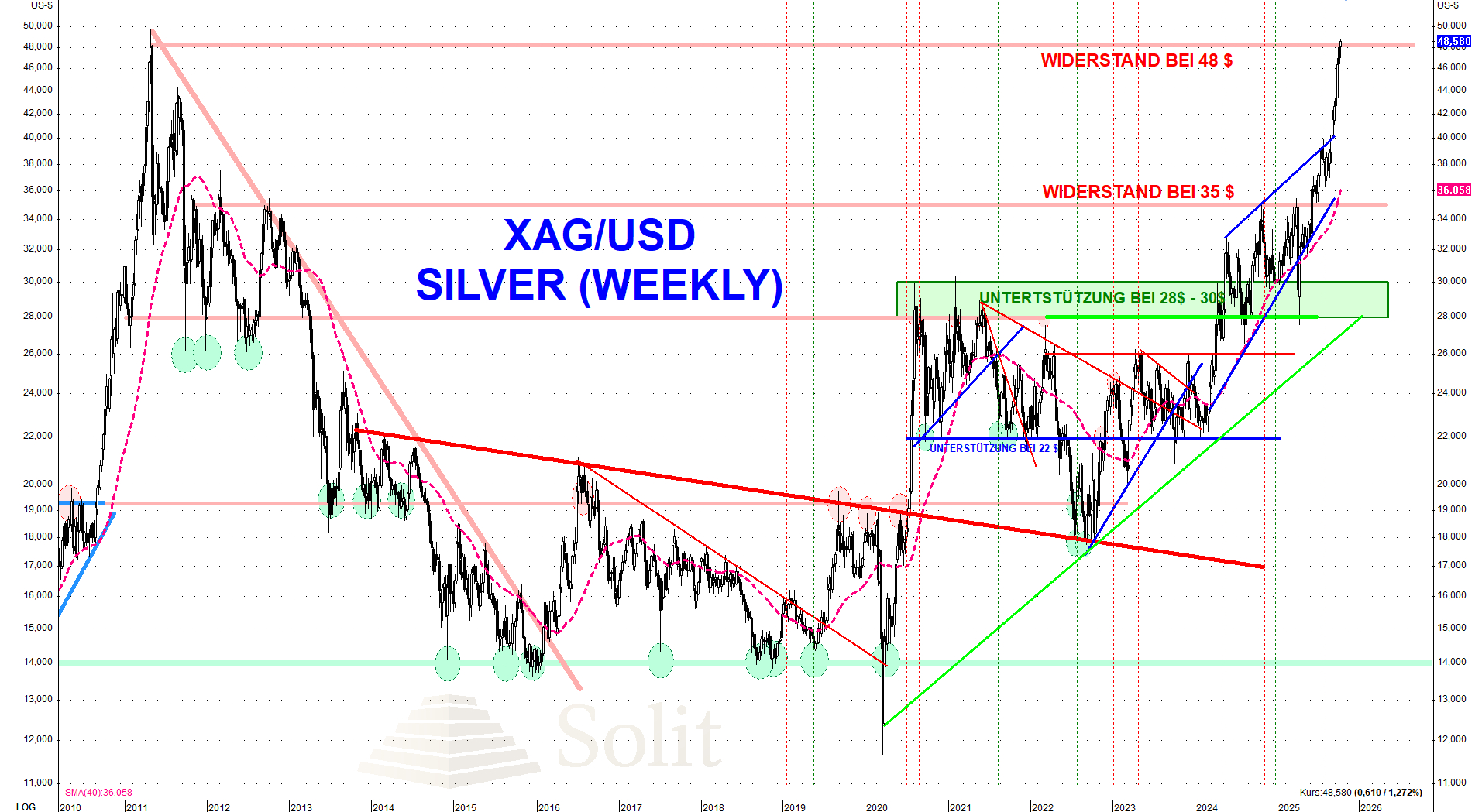 Seit dem Ausbruch des Goldpreises aus einer mehrmonatigen Konsolidierungsphase hat auch die Investmentnachfrage nach Silber deutlich zugenommen. Das Resultat war eine schnelle Rallye bis nahe 50 $ je Feinunze. Am Spotmarkt wurde heute bereits ein Hoch von rund 49 $ erreicht. Sollte der Goldpreis an der Marke von 4.000 $ zunächst ein kurz bis mittelfristiges Top ausbilden und von dort aus konsolidieren oder korrigieren, ist eine entsprechende Reaktion beim Silberpreis wahrscheinlich. Die Dynamik am Silbermarkt bleibt eng an die Entwicklung des Goldpreises gekoppelt, da die Silberrallye primär investitionsgetrieben ist und weniger auf fundamentalen Faktoren beruht.
