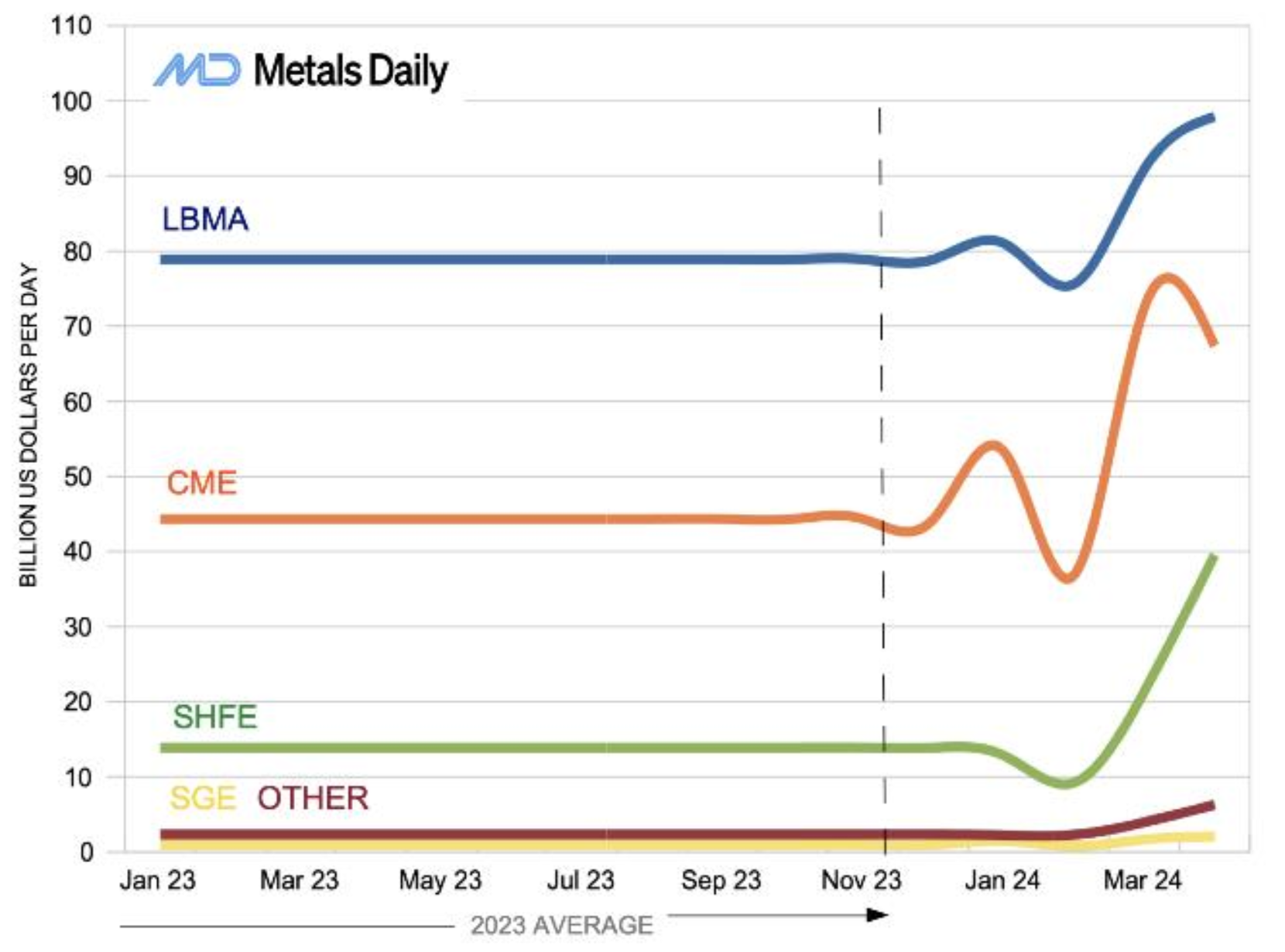 Insbesondere ein bisher einmaliger Anstieg der asiatischen Goldnachfrage scheint mitverantwortlich für diese Rallye am Goldmarkt gewesen zu sein. So hatte sich die Nachfrage an der Shanghai Futures Exchange (SHFE) von Februar bis März sprungartig auf mehr als das Dreifache erhöht, womit kurzzeitig fast das durchschnittliche Niveau des letzten Jahres an der CME in New York erreicht wurde. China importierte im März rund die Hälfte aller Goldexporte aus der Schweiz in Höhe von 71 Tonnen Gold, was den physischen Goldstrom von West nach Ost belegt.