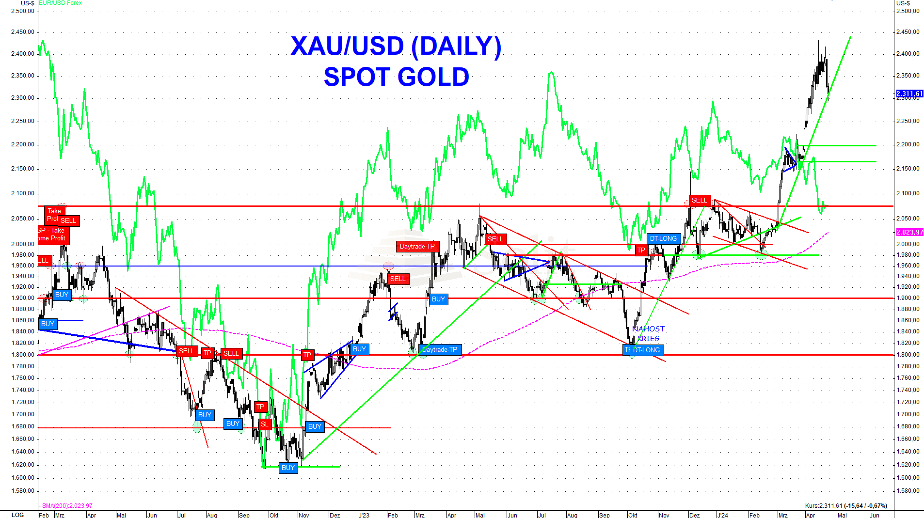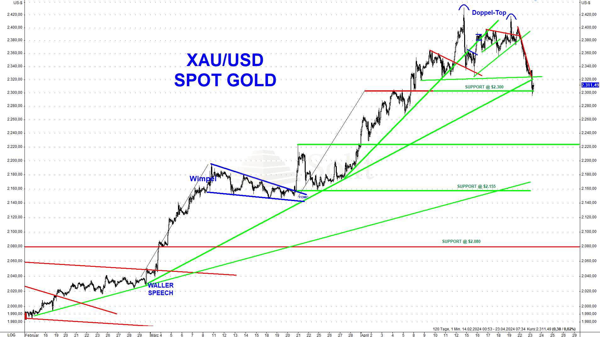 Wir sahen am Montag den stärksten eintägigen Preisrückgang am Goldmarkt seit über einem Jahr und mittlerweile wurde die Unterstützung bei 2.300$ erreicht und getestet. Geopolitische Spannungen in Verbindung mit robusten Zentralbankkäufen, die Ankündigung des Endes der QT-Programme und eine starke Goldnachfrage aus Asien hatten den Goldpreis am 12. April auf ein Rekordhoch von 2.431$ getragen.