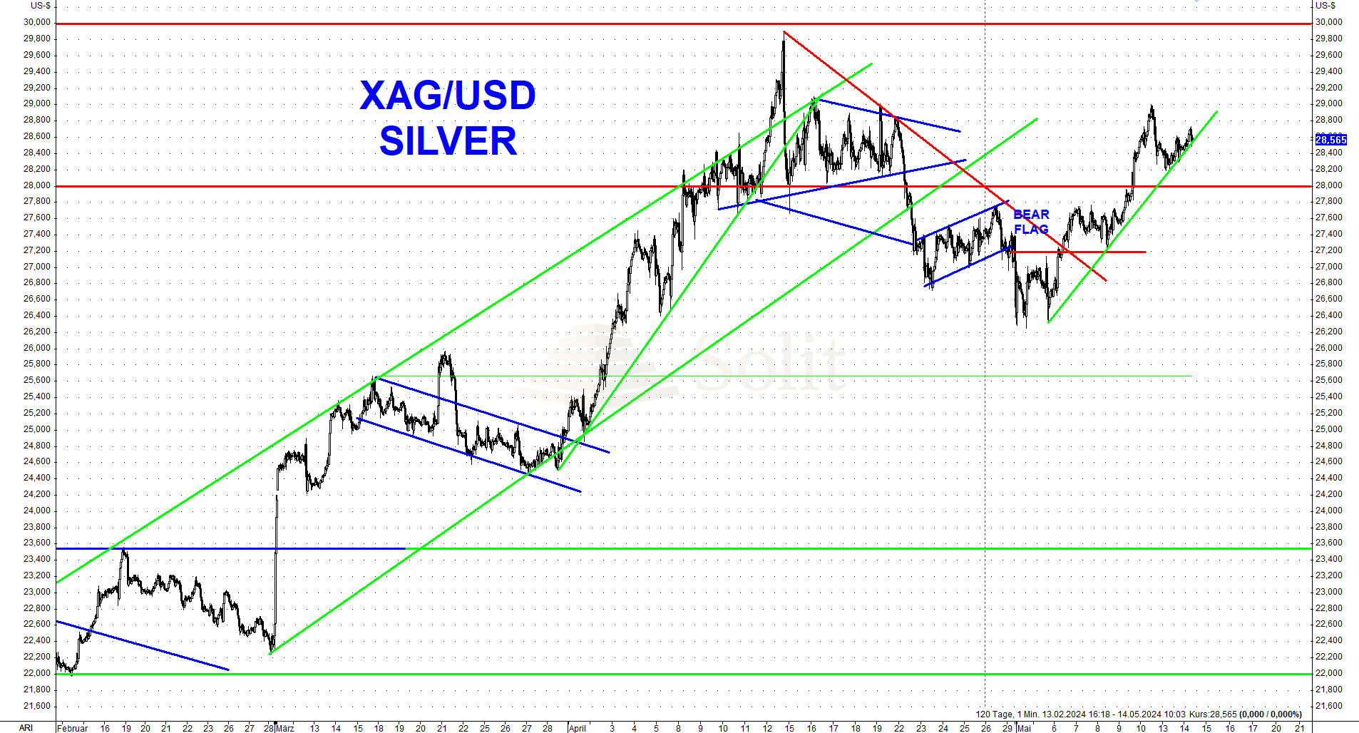 Trotz der schlechteren Wirtschaftsdaten stieg der Silberpreis in der letzten Handelswoche stark um 2,3$ auf 28,76$ am Freitagnachmittag an. Eine Woche davor testete dieser noch die Unterstützung bei 26$, was eine beeindruckende Aufholjagd aufgrund starker physischer Nachfrage in der letzten Woche demonstriert. Der Terminmarkt ist hingegen historisch stark überkauft, was einen kurzfristigen Risikofaktor für den Silberpreis darstellt.