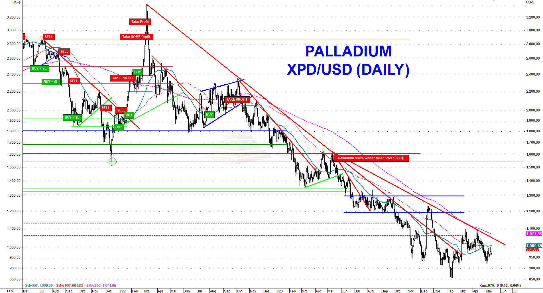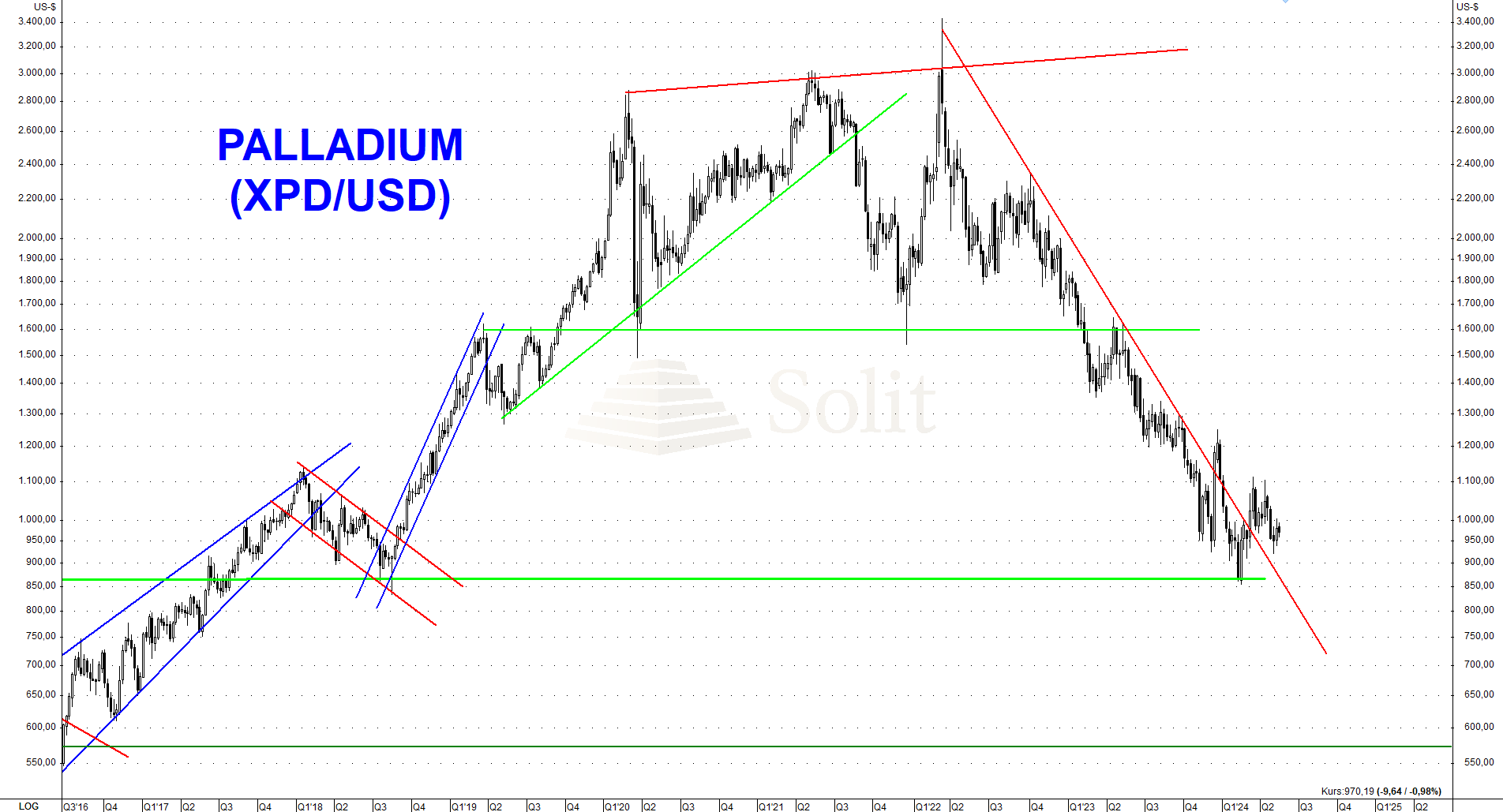 Der Palladiumpreis erreichte in den vergangenen Wochen die langfristige Unterstützung bei 850$, die kurzfristig auf Sicht der nächsten Monate erst einmal Halt bieten dürfte. Ein folgender Bruch des Abwärtstrends würde zu einer kurzweiligen Preiserholung führen, da der Terminmarkt überverkauft ist. Diese Erholung sollte jedoch relativ schnell wieder verkauft werden. Kurzfristig ist nun mit einer Konsolidierung auf diesem niedrigen Niveau zu rechnen. Mit einer Rezession wäre ein nochmaliger starker Preiseinbruch denkbar. Die nächsten technischen Unterstützungsmarke liegt bei 850$ und darunter bei 570$, was in einer Rezession im Rahmen eines Nachfrageschocks durchaus erreicht werden könnte. Letzteres wäre ein sehr interessantes Preisniveau für ein langfristiges Investment auf Sicht von mehreren Jahren.