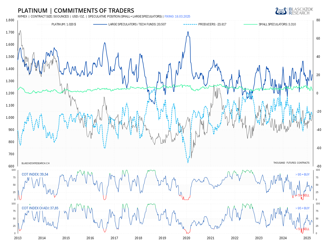 Der Platinpreis stieg zur Vorwoche um 34$, wofür die Spekulanten mit 2,5 Tsd. Kontrakten Long gingen. Das zeigt insgesamt eine neutrale Wochenentwicklung. Der COT-Index fiel dabei von 45 auf 40 Punkte, und auch der COT-Index zum Open Interest adjustiert sank leicht, von 43 auf 38 Punkte.