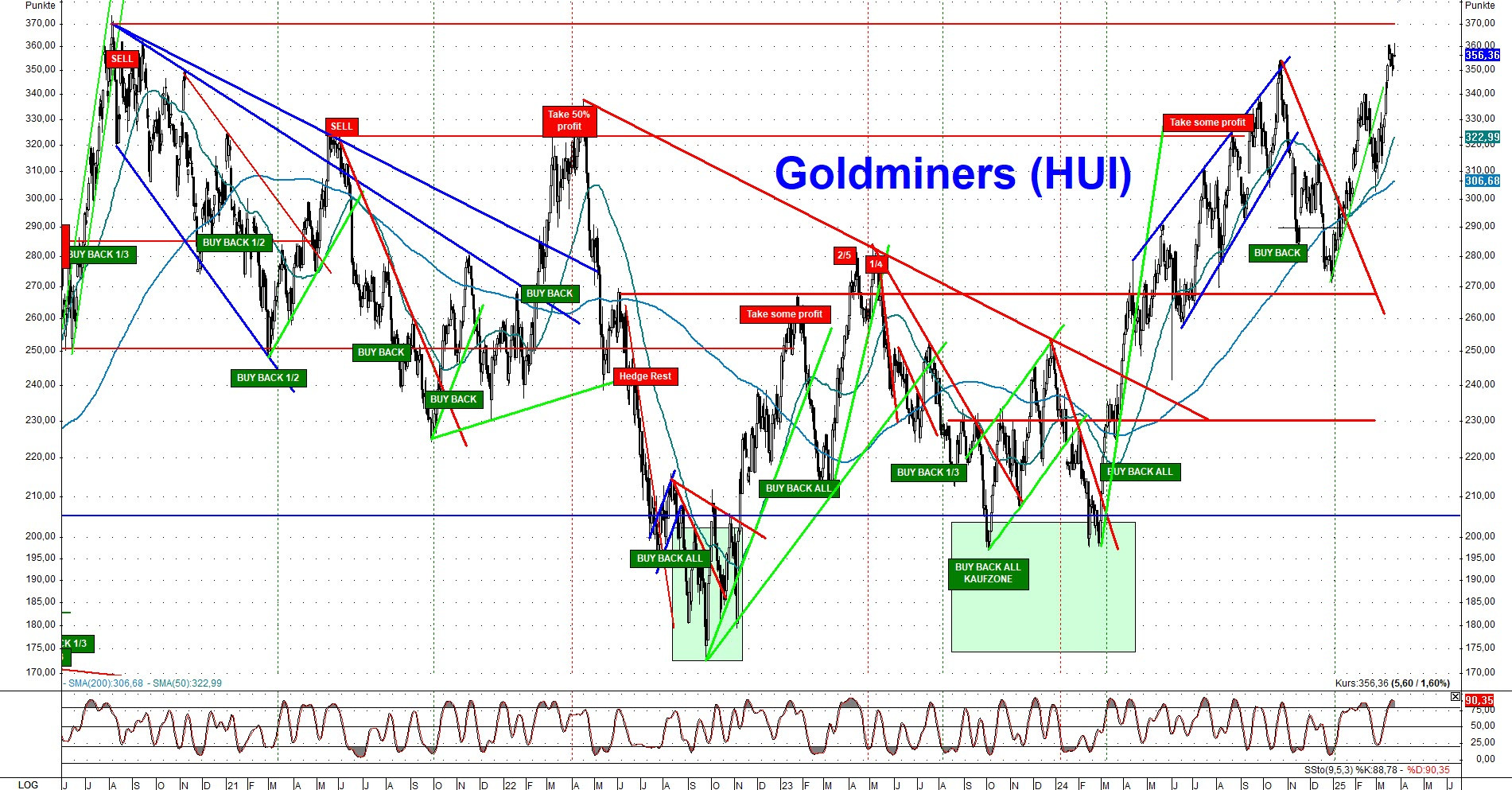 Charttechnisch gesehen steht der HUI jetzt unmittelbar vor einem leichten Widerstand bei 370 Punkten. Da enormes Aufholpotenzial besteht und dieser Widerstand nur schwacher Natur ist, muss die Rallye der Minenaktien hier nicht unbedingt ihr Ende finden, sondern könnte sich diese einfach fortsetzen. Anfang 2024 empfahl ich gebetmühlenartig bei einem HUI-Index von 200 Punkten All in zu gehen. Zuvor hatten wir eine Korrektur in diese Zielzone abgewartet. Seither stiegen die Minenaktien um 80% an, wobei meine Premium-Abonnenten durch einen kurzzeitigen Take Profit mit einem Rückkauf zum Ende des letzten Jahres eine noch größere Rendite erzielen konnten.