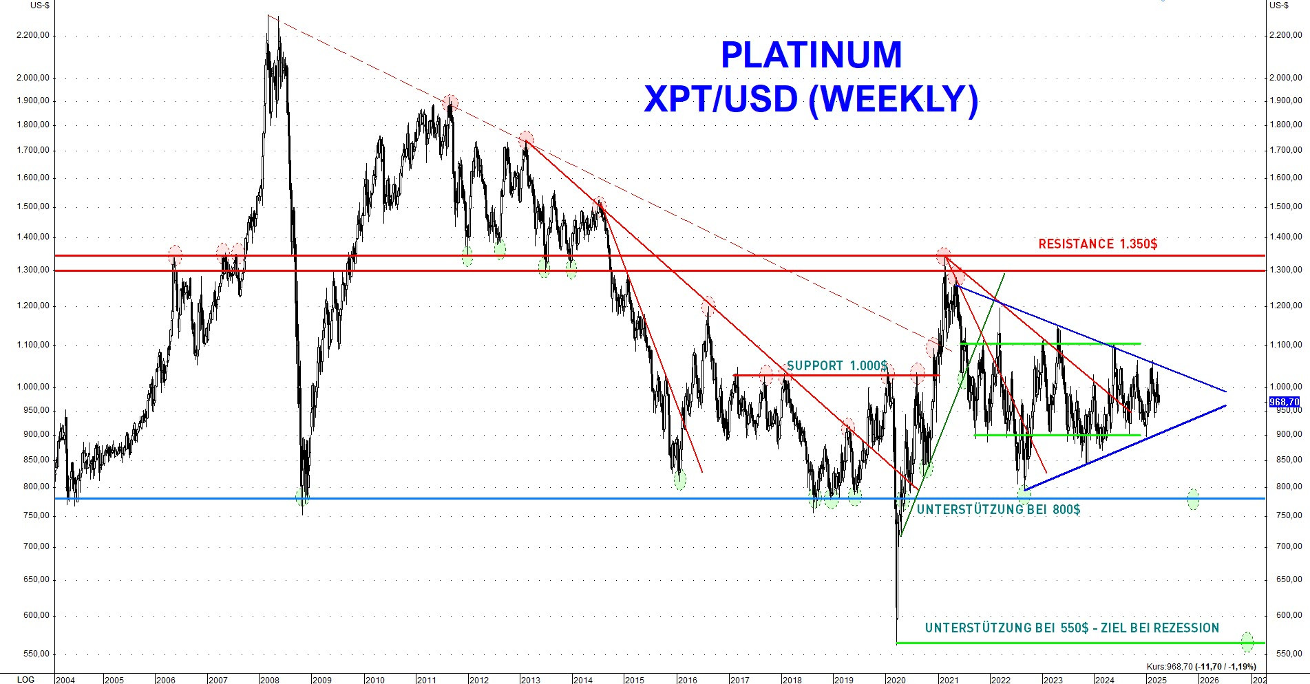 Platin könnte langfristig im Bereich zwischen 800 und 500 US-Dollar eine stabile Unterstützungszone finden. Für Anleger mit einem mittel- bis langfristigen Anlagehorizont bieten Rücksetzer in diese Region attraktive Einstiegsmöglichkeiten. Historische Daten zeigen, dass Rezessionen häufig mit abrupten, kurzfristigen Rückgängen der Platin- und Palladiumpreise einhergehen. Sollte der Preis in einer Rezession auf 600 US-Dollar fallen, wäre dies eine sehr gute Gelegenheit für antizyklische Käufe.