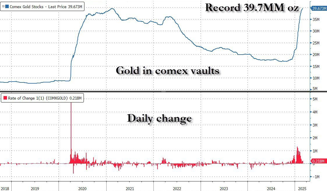 Im vorletzten Marktkommentar ging ich auf das geplante Audit der US-Goldbestände durch US-Präsident Trump und Elon Musk ein. In den letzten Monaten gab es gigantische Abflüsse von Gold aus London in die USA, womöglich um fehlende Bestände im Vorfeld eines Audits wieder aufzufüllen. Diese Zuflüsse in die Tresore der Comex sorgten in dieser Woche für ein neues Allzeithoch von 39,7 Mio. Unzen, womit das Hoch nach der Covid-Panik erstmals übertroffen wurde.