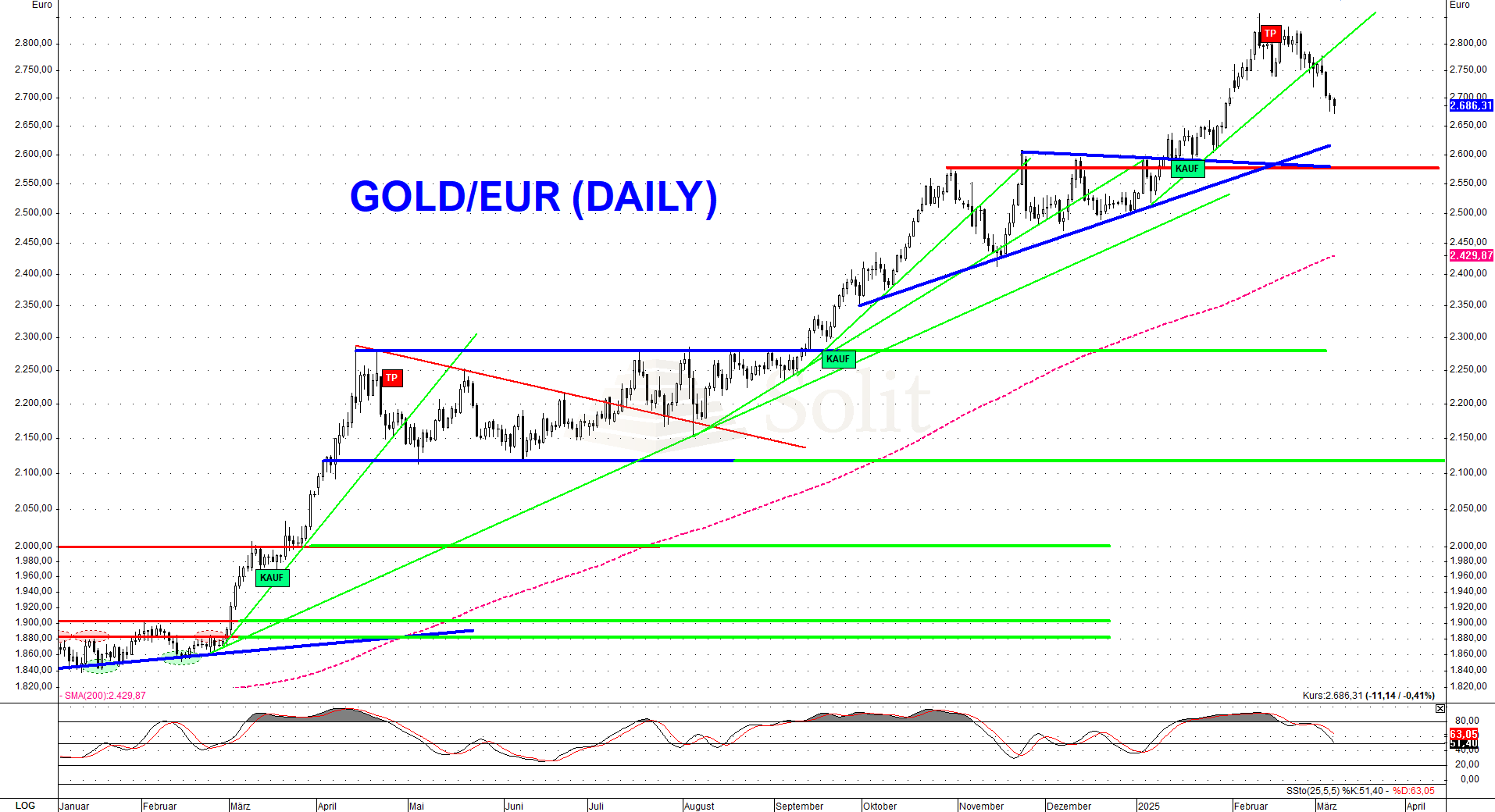 Der Goldpreis in Euro konnte Anfang des Jahres aus seiner Konsolidierungsformation ausbrechen und den Widerstand bei 2.600 Euro überwinden – eine Entwicklung, die wir im Premium-Research bereits erwartet hatten. Mit diesem Ausbruch entstand ein klares Kaufsignal – sowohl für den Goldpreis in Euro als auch für den Goldpreis in US-Dollar. In der Folge stieg der Goldpreis in Euro um 250 Euro je Feinunze auf ein neues Allzeithoch, womit mein Preisziel abgearbeitet wurde und wir die Gewinne im Trading mitnahmen.
