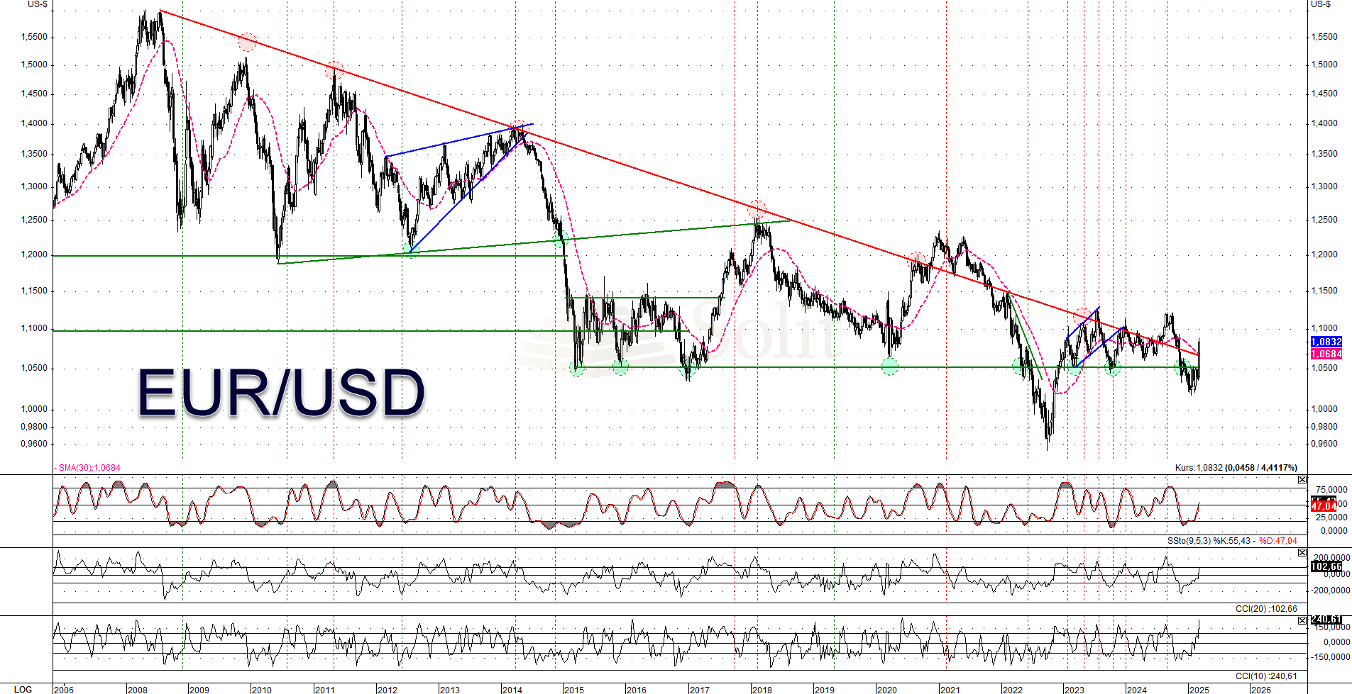 Seit über einer Woche handelt der Goldpreis in einer engen Spanne zwischen 2.900$ und 2.940$, obwohl der US-Dollar im gleichen Zeitraum nochmals leicht an Wert verlor. In den letzten beiden Wochen brach der USD-Index von 107,6 auf 103,5 Punkte ein, während der Euro raketenartig durch die Decke ging und von unter 1,04$ auf 1,095$ angestiegen war, womit der technische Widerstand bei 1,10$, an dem viele Marktteilnehmer Short gingen, fast erreicht wurde. Die Euro befindet sich seit 2008 in einem Abwärtstrend, der bis dato intakt ist und sich angesichts der aktuellen fiskalpolitischen Entwicklungen in Deutschland auch fortsetzen dürfte.