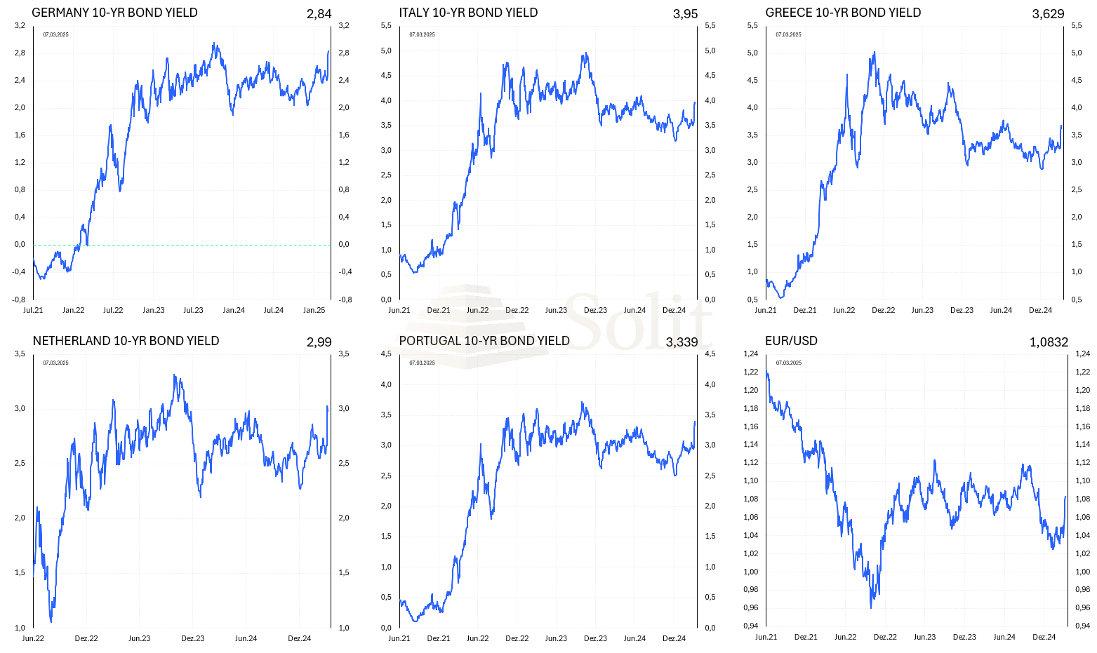 Die Ankündigung dieses Schuldentsunamis hat bereits zu einem Anstieg der Rendite auf deutsche Staatsanleihen um 0,5 Prozentpunkte geführt. Die gesamte Staatsschuld Deutschlands wird dadurch teurer, da höhere Zinsen auch auf bestehende Schulden angewandt werden. Der Anstieg der deutschen Renditen hat die Kreditkosten näher an die entsprechenden US-Schulden herangebracht. Das zeigt, dass die Anleger seit der Bekanntgabe der deutschen Ausgabenpläne einen geringeren Renditeaufschlag für US-Anleihen anstelle von Bundesanleihen verlangen. Aber auch deutsche Unternehmen werden unter den steigenden Kreditkosten leiden und im international an Wettbewerbsfähigkeit verlieren. Das letzte Mal, dass die deutschen Anleihekosten so stark anstiegen, war nach dem Fall der Berliner Mauer im November 1989.