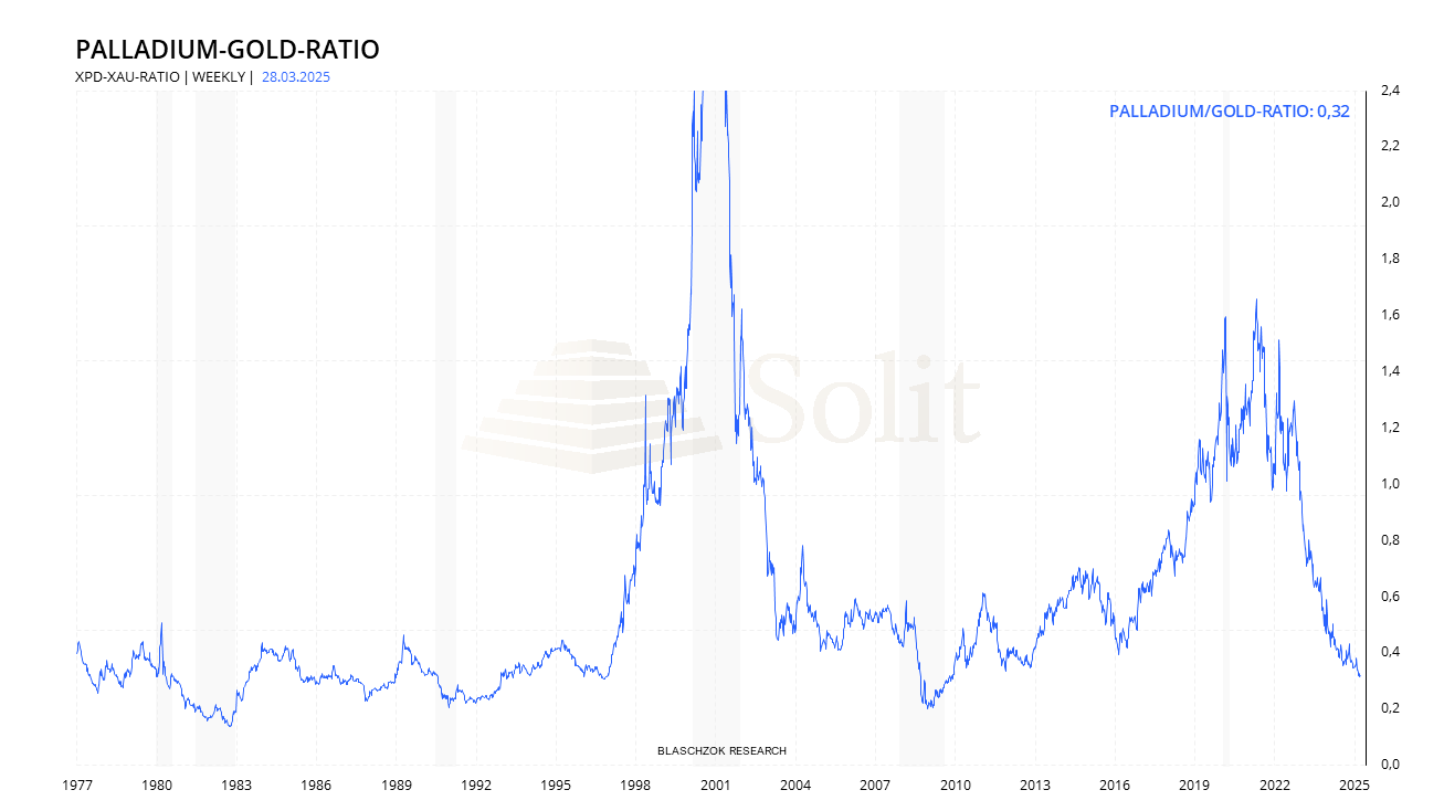 Langfristig bleibt die Marktentwicklung jedoch unklar, da das wachsende Angebot aus dem Recyclingbereich voraussichtlich anhaltenden Einfluss auf den Markt haben wird. Parallel dazu dürfte sich das bereits historisch niedrige Palladium-Gold-Ratio von derzeit 0,33 in den kommenden Jahren weiter verringern – womöglich wird das Ratio auf ein neues Allzeittief fallen.