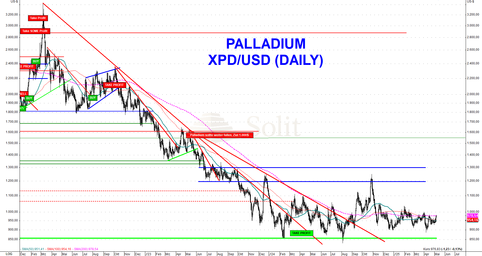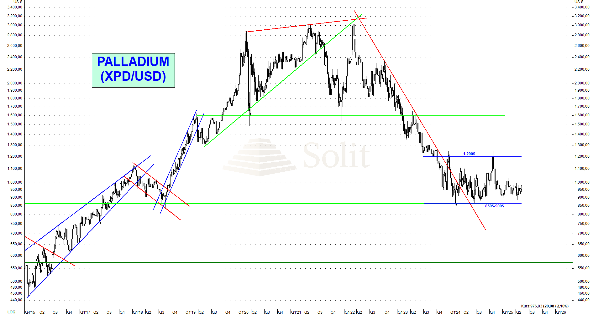 Zusätzlich stellt eine globale wirtschaftliche Abschwächung ein weiteres Risiko für den Palladiumpreis dar. Im Falle einer Rezession wäre ein kurzfristiger und markanter Rückgang unter die Unterstützungszone bei 850$ sehr wahrscheinlich. Die nächste technische Unterstützung befindet sich erst bei 570$. Auf diesem Niveau sehe ich aktuell eine attraktive Chance für einen kurz- bis mittelfristigen Einstieg in Palladium, wobei wir die Lage dort dann neu analysieren müssen.