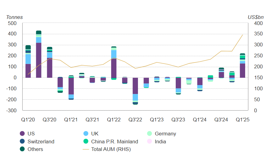 Die aktuellen Zahlen des World Gold Council zeigen, dass die weltweite Goldnachfrage im ersten Quartal ein Rekordniveau erreicht hat. Der durchschnittliche Quartalspreis stieg dadurch auf 2.860 $ je Feinunze, was einem Plus von 38 % im Vergleich zum Vorjahr entspricht. Haupttreiber dieser Entwicklung war ein sprunghafter Anstieg der ETF-Zuflüsse von 19 Tonnen im Vorquartal auf 226 Tonnen.