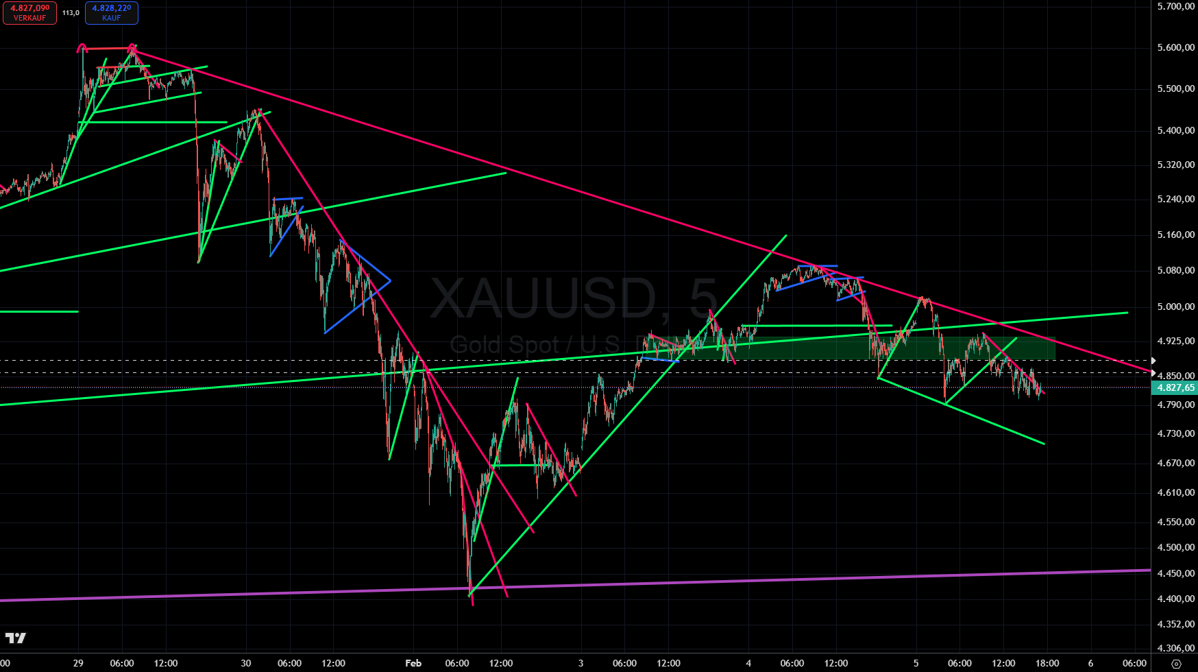 Der beste Monat für Gold seit 1999 endete mit einem Verlust von 5 Billionen US-Dollar an Marktkapitalisierung, allein in den letzten beiden Handelstagen des Monats, mit einem Preiseinbruch um 700 $ auf rund 4.900 $ zum Monatsende. Zwischenzeitlich testete der Goldpreis gar seinen Aufwärtstrend bei 4.403 $, wobei eine folgende Erholung eine erneute Chance für einen Short-Einstieg bei 5.090$ brachte.