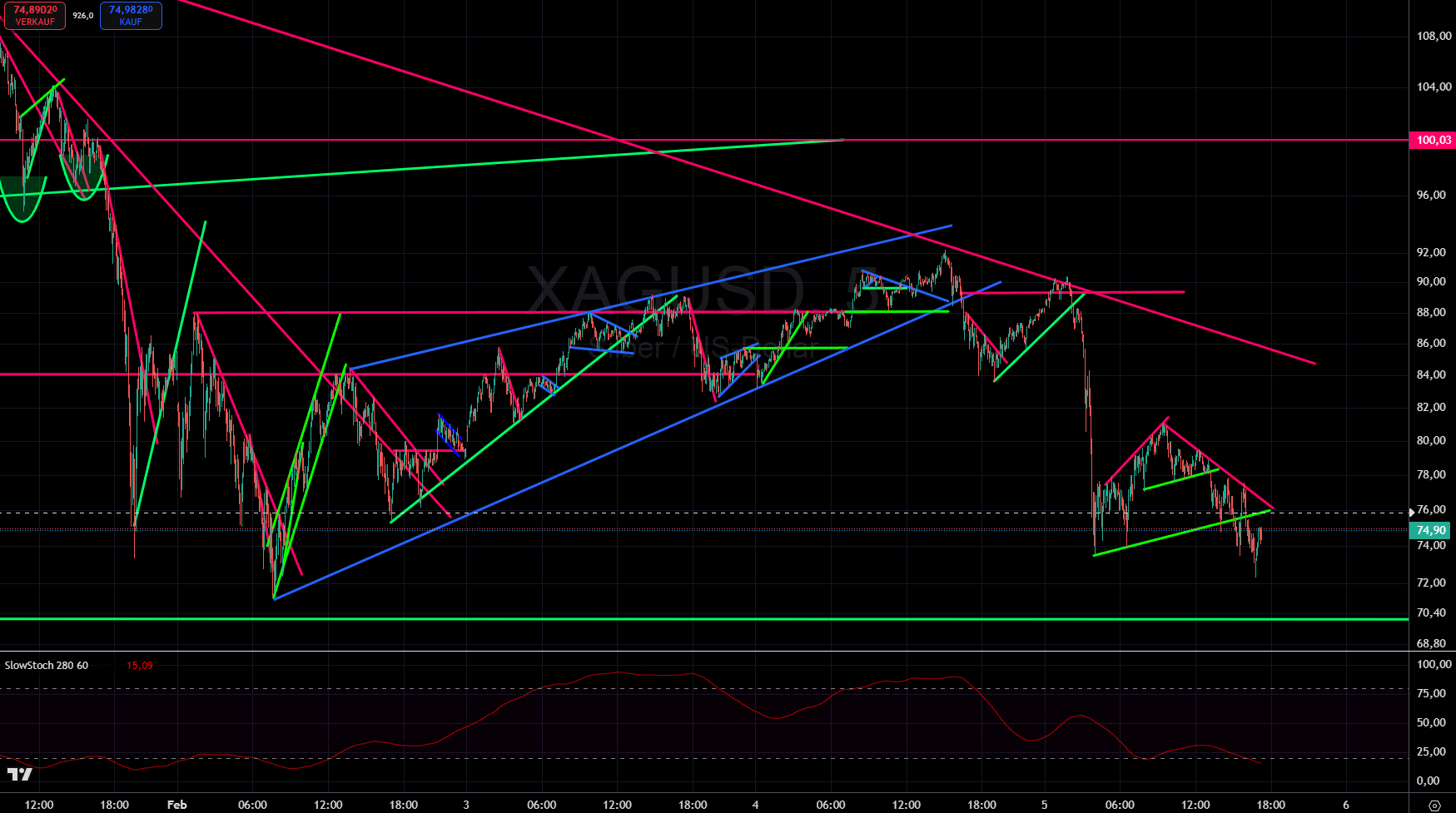 Silber stürzte vom neuen Allzeithoch bei 121,64 $ (Donnerstag) um 39 % auf 73,86 $ im Tief (Freitag) in einem monumentalen Crash ab, wodurch die Gewinne seit Jahresbeginn vollständig zunichte gemacht wurden. Die Berichte über die Nominierung des als hawkish geltenden Kevin Warsh als neuen Fed-Chef waren bestenfalls ein Auslöser, jedoch nicht die Ursache. Eine Korrektur des zuletzt exponentiellen Anstiegs war längst überfällig. Warsh ist eine überraschende Wahl, da Trump eigentlich den für seinen Geschmack zu hawkishen Powell durch eine Taube ersetzen wollte. Zwischenzeitlich hatte sich der Silberpreis wieder auf 92 $ erholt, da das Sentiment nach wie vor sehr bullisch ist und die meisten Investoren darin eine Korrektur und eine Einstiegschance in eine intakte Rallye sehen. Mittwochnacht wurden diese Bullen jedoch mit einem erneuten Preiseinbruch binnen zwei Stunden um 2 Uhr morgens im asiatischen Handel um 16,50$ (-18%) auf 73,50$ gegrillt. Short-Trader im Westen schliefen und konnten wenig davon profitieren, während Bullen, die keine Stopps gesetzt hatten, heute einen schlechten Start in den Tag hatten.