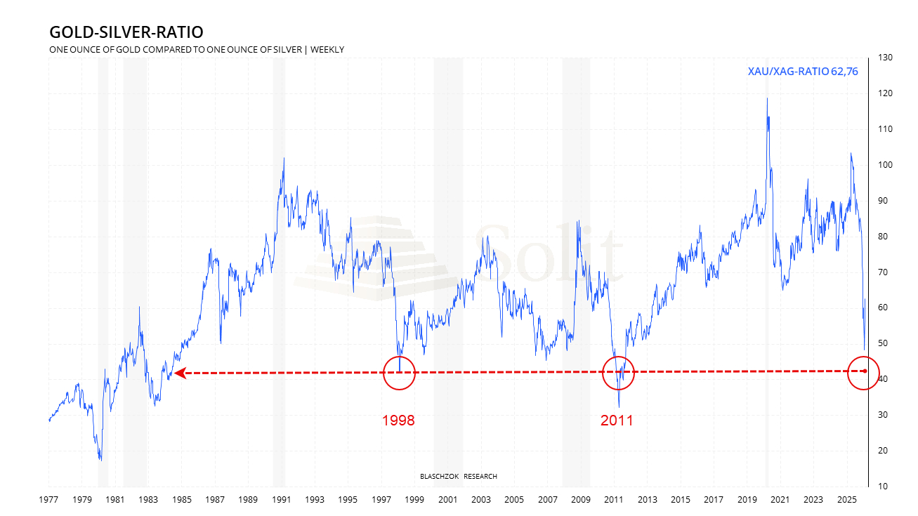 Nur wenige Investoren waren demütig angesichts eines Preisanstiegs von über 150 % binnen drei Monaten und rund 440 % binnen zwei Jahren und nahmen Gewinne mit. Ich hatte bereits im letzten Marktkommentar vor einer Woche das Ende des Anstiegs bei Silber in Aussicht gestellt und angesichts eines Gold-Silber-Ratios von 44 zu Umschichtungen in Gold geraten.