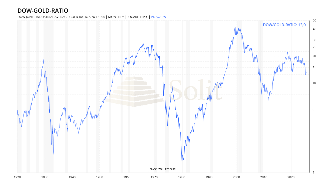 Das Dow-Gold-Ratio zeigt bereits deutlich, wie stark Aktien im Verhältnis zu Gold verloren haben. In den letzten sieben Jahren ist der Aktienmarkt zu Gold um rund 40 % eingebrochen. Ich gehe davon aus, dass dieses Verhältnis in den kommenden Jahren weiter in den Bereich von 2 zu 1 fallen wird.