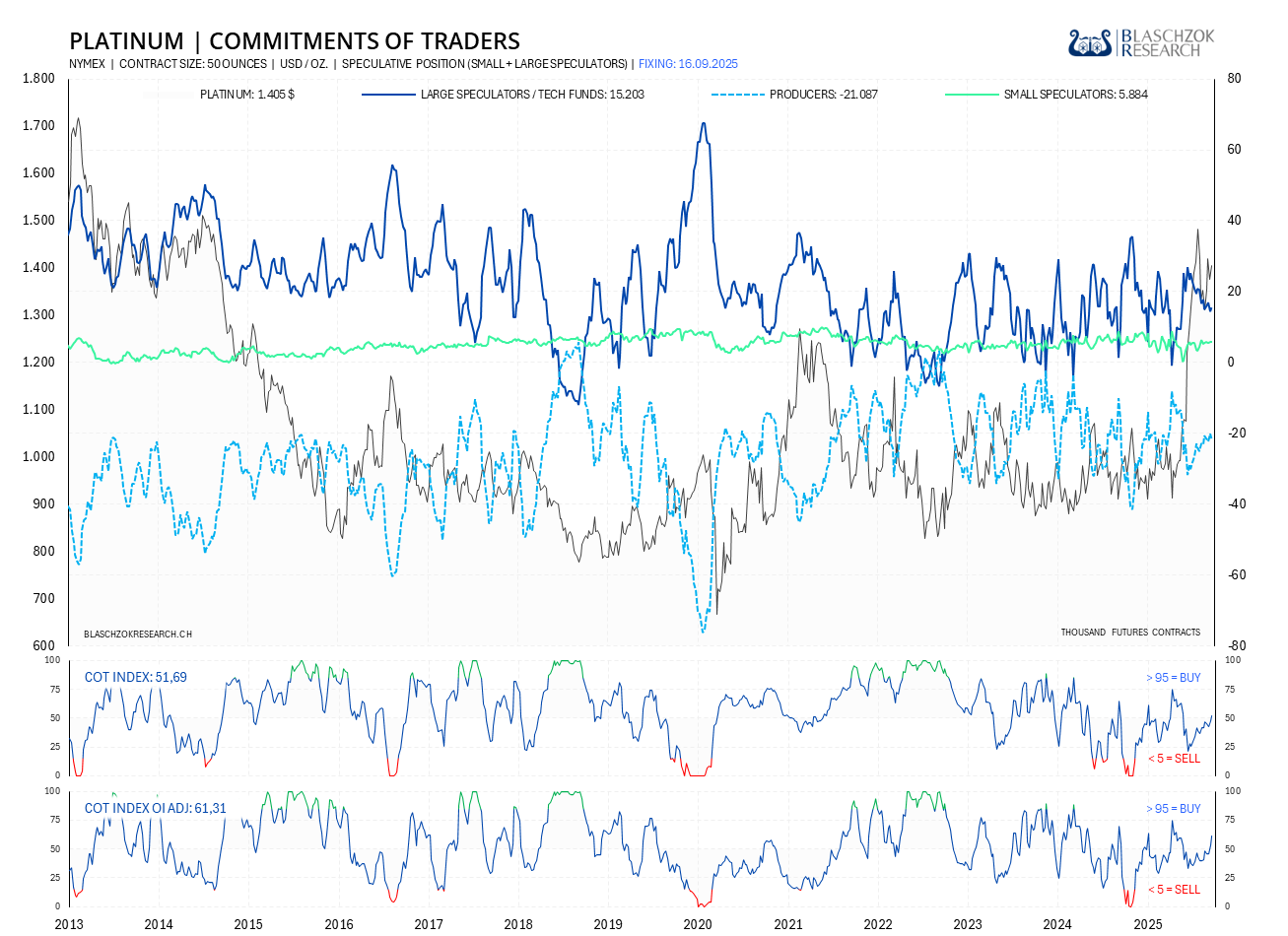 Der COT-Report wird immer freitags seitens der US-Terminmarktaufsicht (CFTC) veröffentlicht, wobei der Stichtag der Datenerhebung der Schlusskurs vom Dienstag ist. Die COT-Daten werden also immer mit einer Verzögerung von drei Tagen veröffentlicht. Premium Abonnenten von Blaschzok Research erhalten vor Handelsschluss am Freitag ein Blitzupdate mit Analysen zu Gold, Silber und Platin. Die COT-Daten ermöglichen einen Blick in die Zukunft, da sie einerseits ein Sentiment-Indikator sind und andererseits eine gute Einschätzung des Angebots und der Nachfrage am physischen Markt ermöglichen. Mit ihnen hat man einen Vorteil im Trading am Rohstoffmarkt.