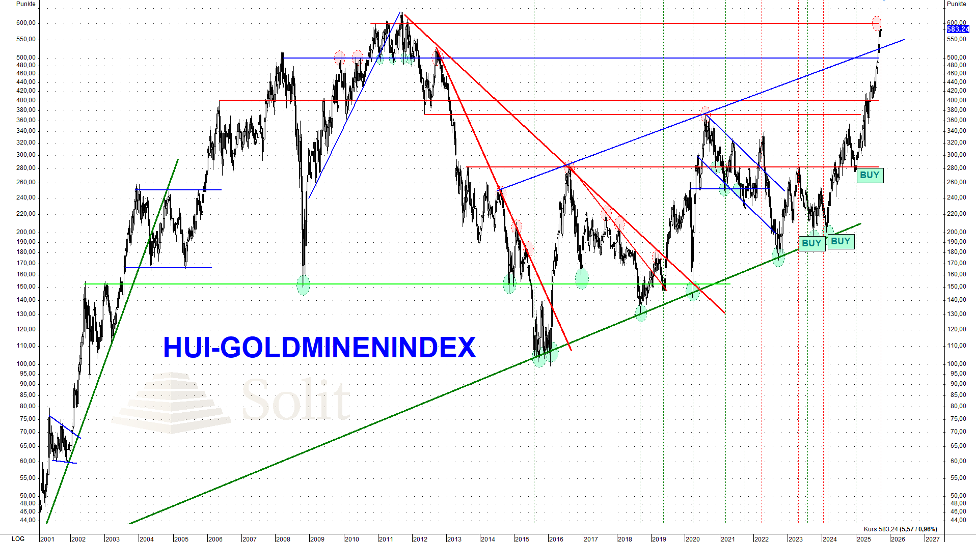 Von 275 Punkten zu Jahresbeginn kletterte der HUI-Index inzwischen auf 608 Punkte und legte damit über 100 % zu. Damit wurde das Allzeithoch aus den Jahren 2010/2011 erreicht. Nach dieser starken Rallye bildet sich nun ein markanter Widerstandsbereich zwischen 500 und 600 Punkten, den Trader im Blick behalten sollten. Die erwartete Aufholbewegung der Minenaktien hat sich eindrucksvoll bestätigt. Bereits bei 200 Punkten hatte ich meinen Premium-Abonnenten ein klares Kaufsignal gegeben und empfohlen, antizyklisch nicht nur konsequent einzusteigen, sondern auch Hebelprodukte zu nutzen. Nachdem die Nachhaltigkeit der Rallye immer offensichtlicher wurde, gab ich ein weiteres Kaufsignal und riet dazu, investiert zu bleiben.