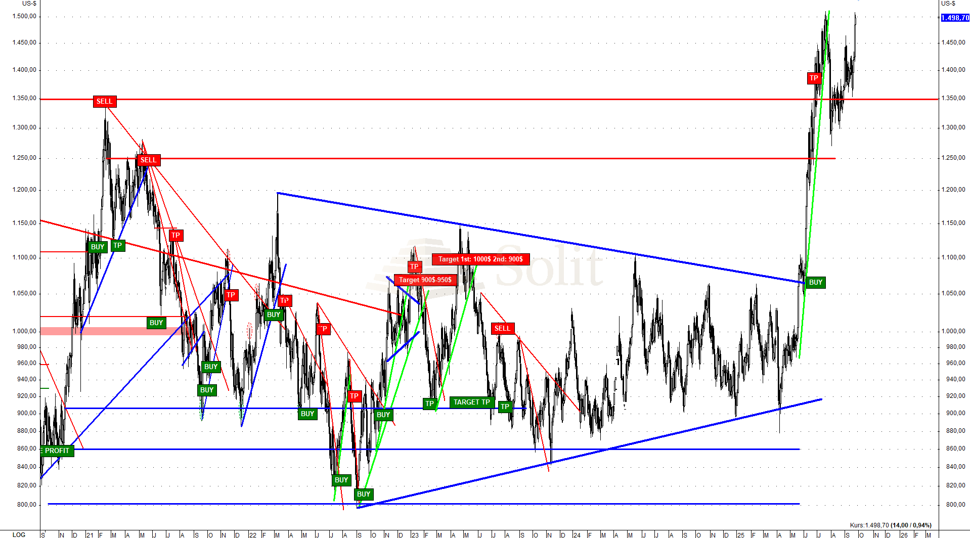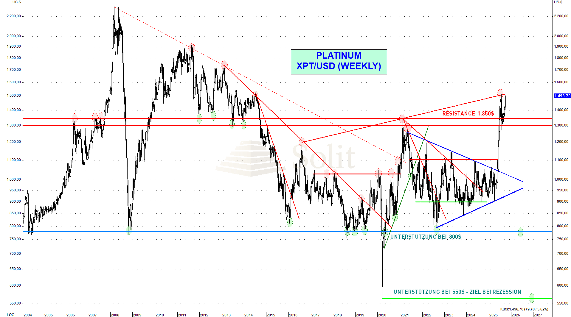 Man darf also Long gehen oder bleiben, muss aber mit engem Risikomanagement arbeiten und den Stopp im Markt haben. Ein Spike um 200–300 $ wäre denkbar, doch sollte man dann auch die Gewinne mitnehmen. Mittel- bis langfristig bleibt jedoch das Risiko eines massiven Abverkaufs bestehen, falls eine Rezession eintritt. In diesem Szenario könnte der Platinpreis wieder auf 800 $ oder tiefer fallen.