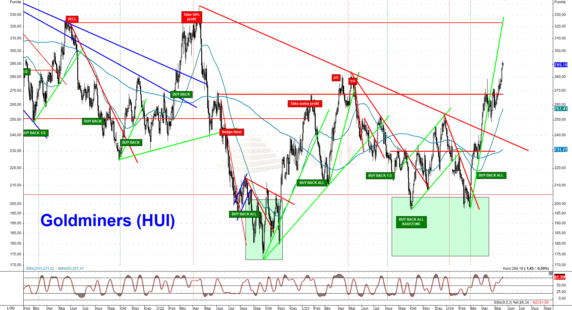 Die Goldminenaktien haben sich unterdessen im letzten Monat stärker nach oben entwickelt als der Goldpreis selbst. Viele Investoren werden aktuell erst sehr spät auf den Anstieg des Goldpreises aufmerksam und springen nachträglich auf die noch immer günstigen Goldminenaktien auf. Der HUI-Goldminenindex erreichte in der letzten Handelswoche unterdessen die 290 Punkte, was einem Plus von 45% seit Februar entspricht. Ich hatte meinen Premium-Abonnenten bei 200 Punkten ein antizyklisches Kaufsignal für die Minenaktien gegeben, nachdem wir zuvor zum Hoch verkauft und Cash gehalten hatten, womit meine Kunden bereits ein Plus von 45% verbuchen können.