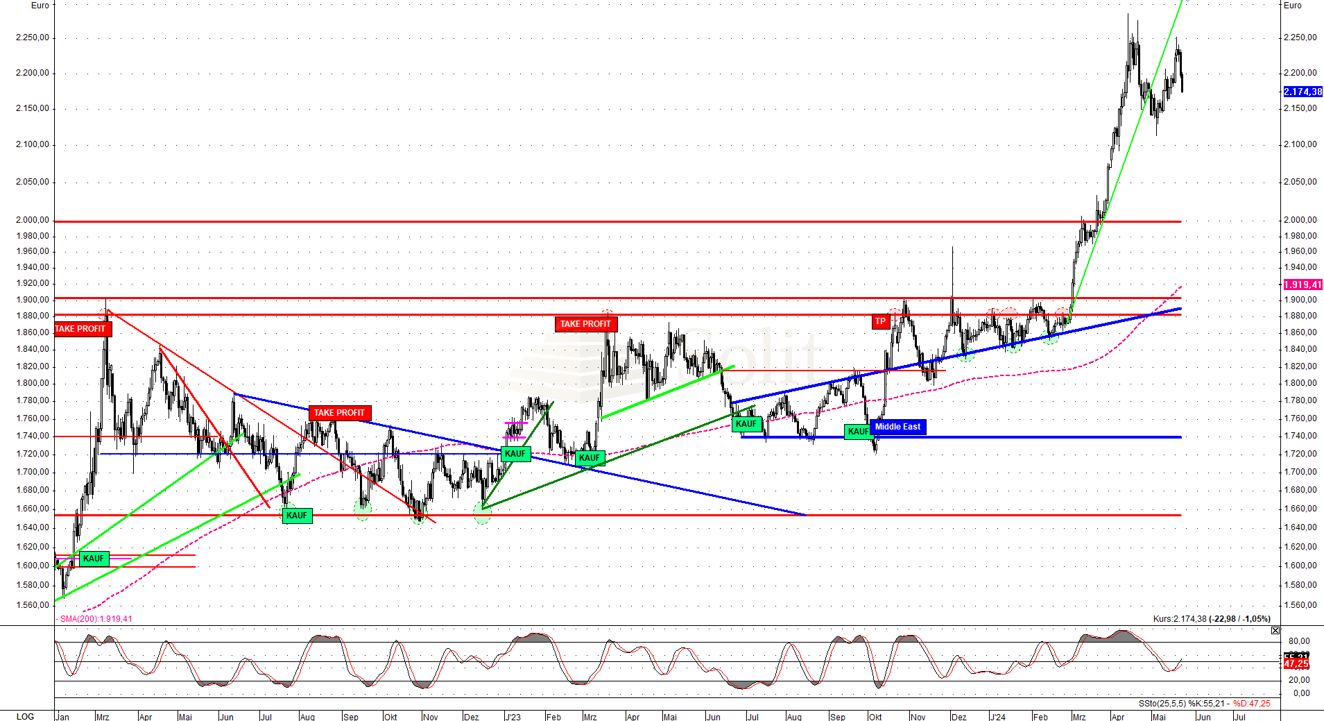 Charttechnisch achteten Spekulanten auf den kurzfristigen grün eingezeichneten Aufwärtstrend, denn nachdem dieser brach, könnte sich eine erneutes Doppel-Top ausbilden und ein erneuter Rücksetzer auf 2.280$ ist nun auf dem Tisch. Die letzte Unterstützung ist der Abwärtstrend bei 2.350$, der jetzt halten muss. Hält dieser, so handelt es sich um einen Pull Back an das Ausbruchsniveau und der Preisanstieg könnte sich fortsetzen, wofür die Stärke der letzten beiden Wochen spricht.