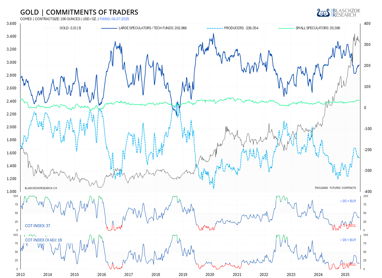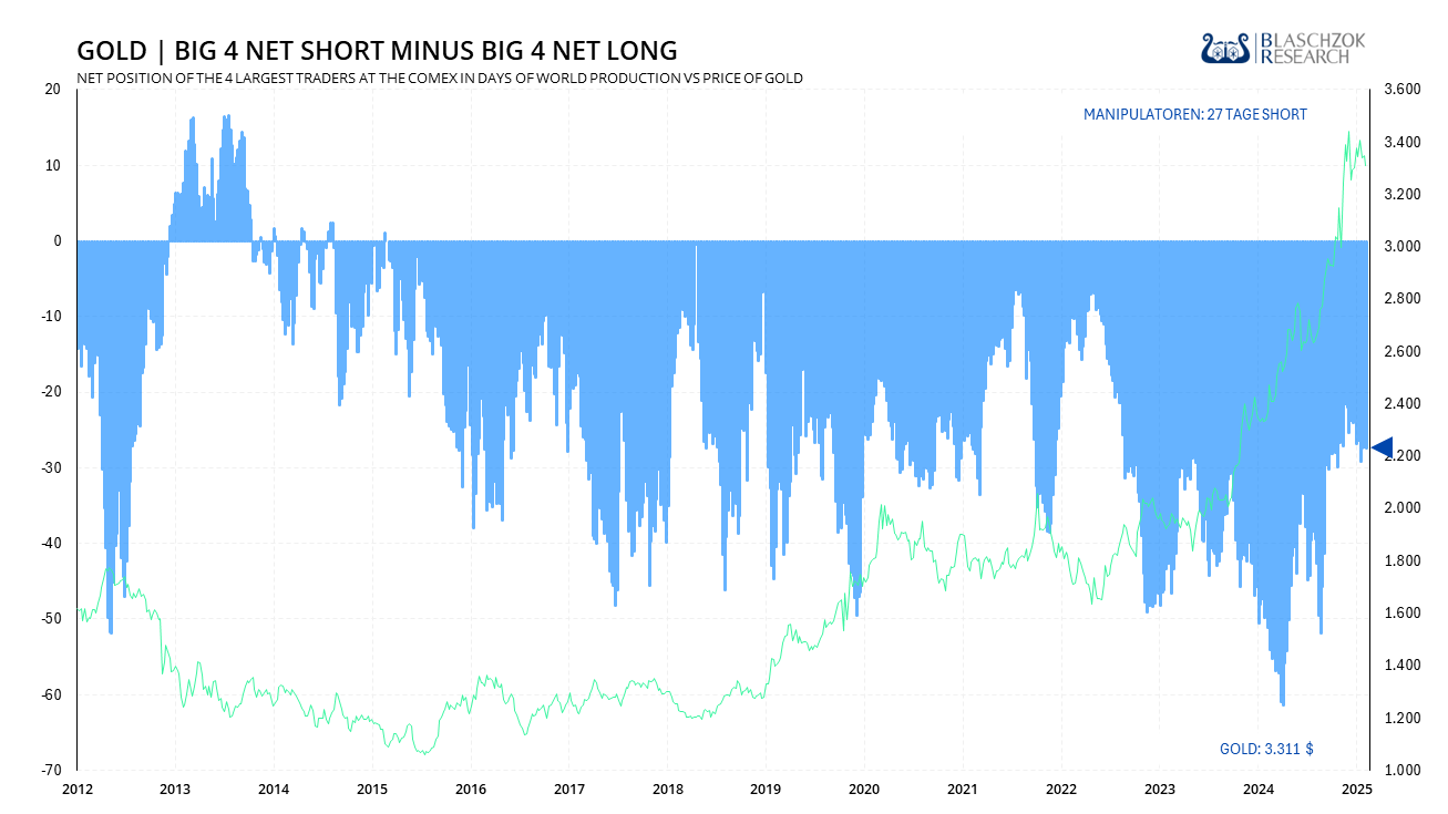 Wir sehen nun den zweiten Monat in Folge neutrale bis leicht schwache Terminmarktdaten, was ein Novum darstellt, nach eineinhalb Jahren mit einem klar ersichtlichen physischen Defizit am Goldmarkt, das sich deutlich in den COT-Daten abbildete. Der Short-Squeeze der großen Händler an der COMEX scheint abgeschlossen zu sein. Das ausgeglichene Verhältnis zwischen Angebot und Nachfrage, deutet darauf hin, dass der Goldpreis vorerst weiter innerhalb einer Spanne zwischen 3.000 $ und 3.500 $ konsolidieren dürfte.