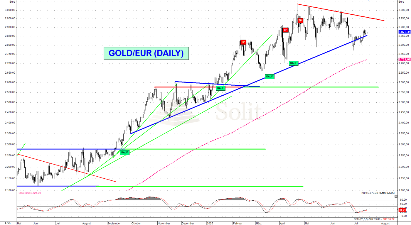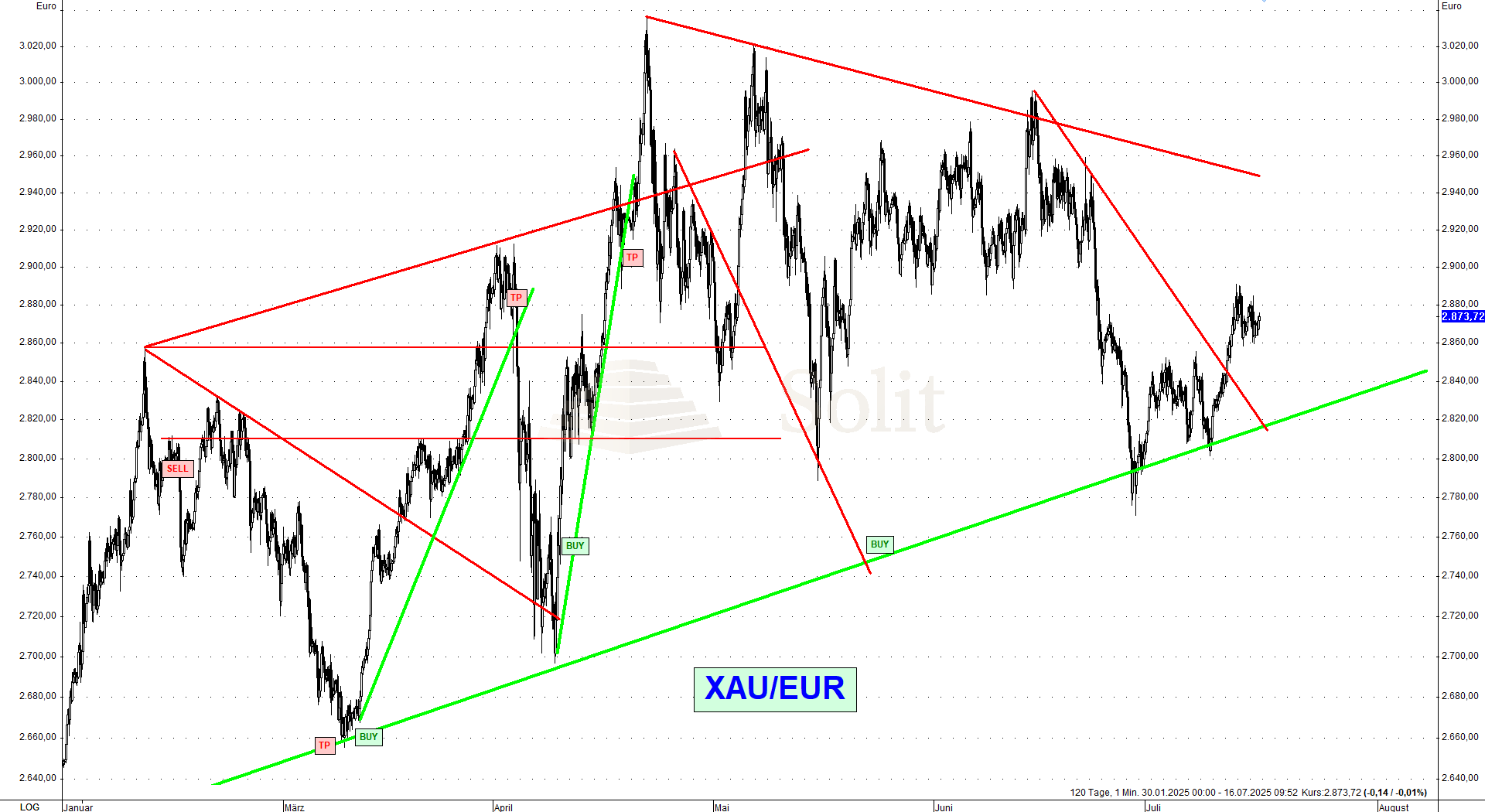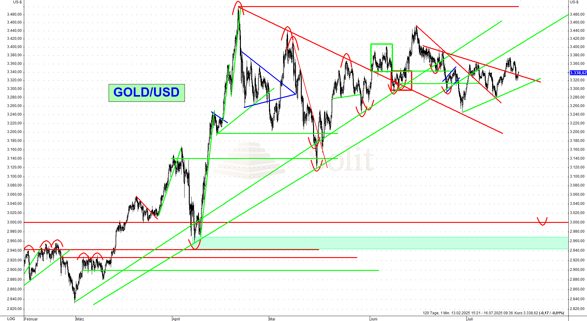 Diese Handelsspanne könnte noch über einen längeren Zeitraum Bestand haben, insbesondere da der Goldpreis zuletzt beide Aufwärtstrendlinien gebrochen hat und nun erneut Gefahr läuft, auf die Unterseite der Spanne in Richtung 3.000 $ zurückzufallen. Sollte es am 1. August zur Einführung neuer Zölle kommen, könnte dies den Gold- und insbesondere den Silbermarkt kurzfristig zusätzlich belasten.