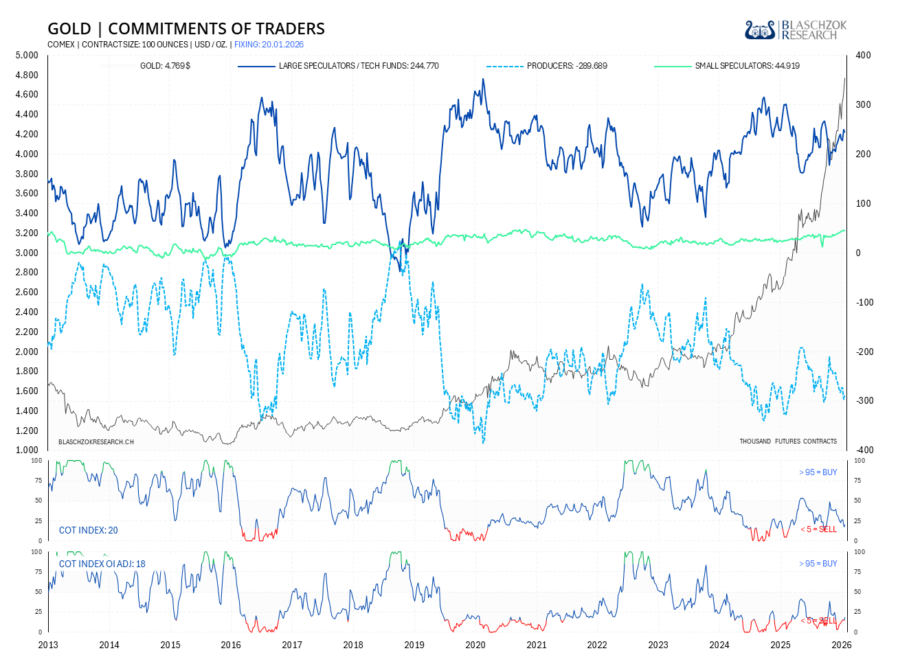 Der COT-Report wird immer freitags seitens der US-Terminmarktaufsicht (CFTC) veröffentlicht, wobei der Stichtag der Datenerhebung der Schlusskurs vom Dienstag ist. Die COT-Daten werden also immer mit einer Verzögerung von drei Tagen veröffentlicht. Premium Abonnenten von Blaschzok Research erhalten vor Handelsschluss am Freitag ein Blitzupdate mit Analysen zu Gold, Silber und Platin. Die COT-Daten ermöglichen einen Blick in die Zukunft, da sie einerseits ein Sentiment-Indikator sind und andererseits eine gute Einschätzung des Angebots und der Nachfrage am physischen Markt ermöglichen. Mit ihnen hat man einen Vorteil im Trading am Rohstoffmarkt.