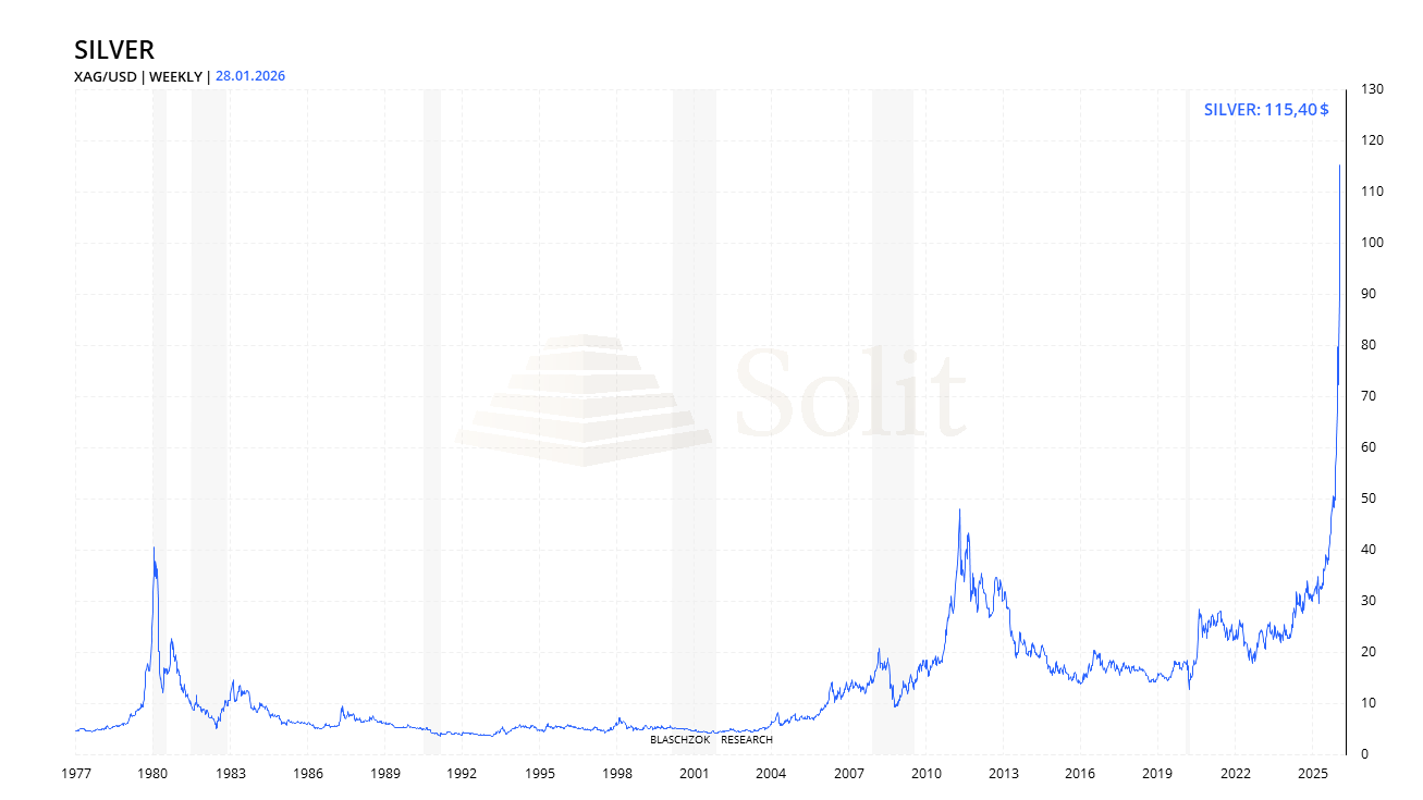 Bis Mitte 2025 hatte sich der Silberpreis zuvor über mehr als ein Jahr in einer engen Handelsspanne von rund 5$ bewegt, ohne dass sich am Markt ein Defizit abzeichnete, während Gold im selben Zeitraum von Rekord zu Rekord lief. Parallel dazu setzten Investoren zunehmend auf eine Aufholjagd bei Silber, obwohl Fundamentaldaten und das Preisverhalten der Vorjahre diese Dynamik nur begrenzt stützten. Die stark steigende Investmentnachfrage wurde schließlich zur selbsterfüllenden Prophezeiung in einem relativ kleinen Silbermarkt. Der Preis zog an und inzwischen sind Tagesschwankungen von 5$ bis 10$ die neue Normalität. Der starke Preisanstieg selbst ist mittlerweile der zentrale Treiber der Rallye. Immer mehr Investoren und Spekulanten kaufen in Panik, um eine weitere Bewegung von nochmals 100% oder 200% nicht zu verpassen, obwohl das kurzfristige Chance Risiko Verhältnis deutlich schlechter geworden ist und die Volatilität spürbar zugenommen hat.
