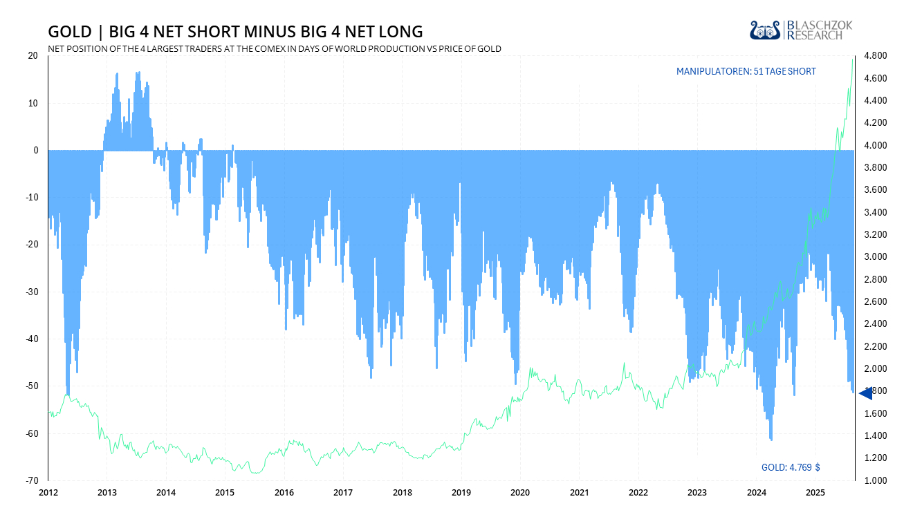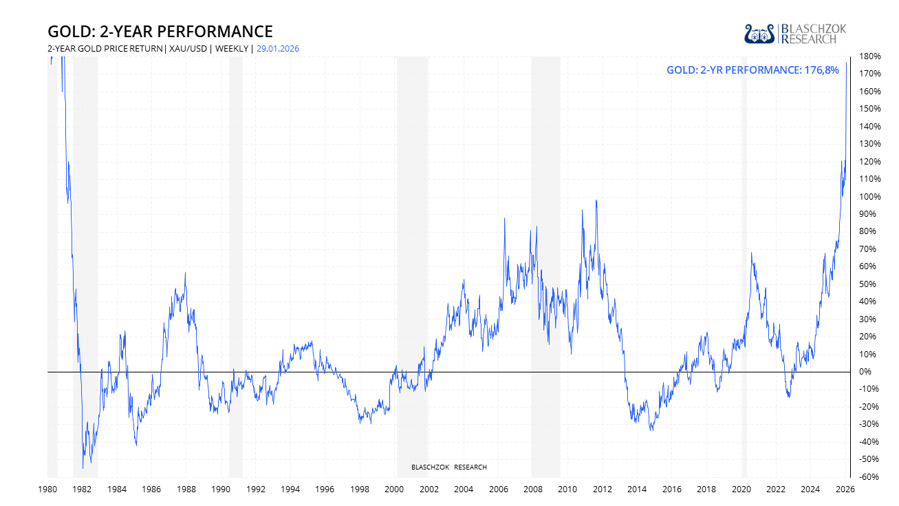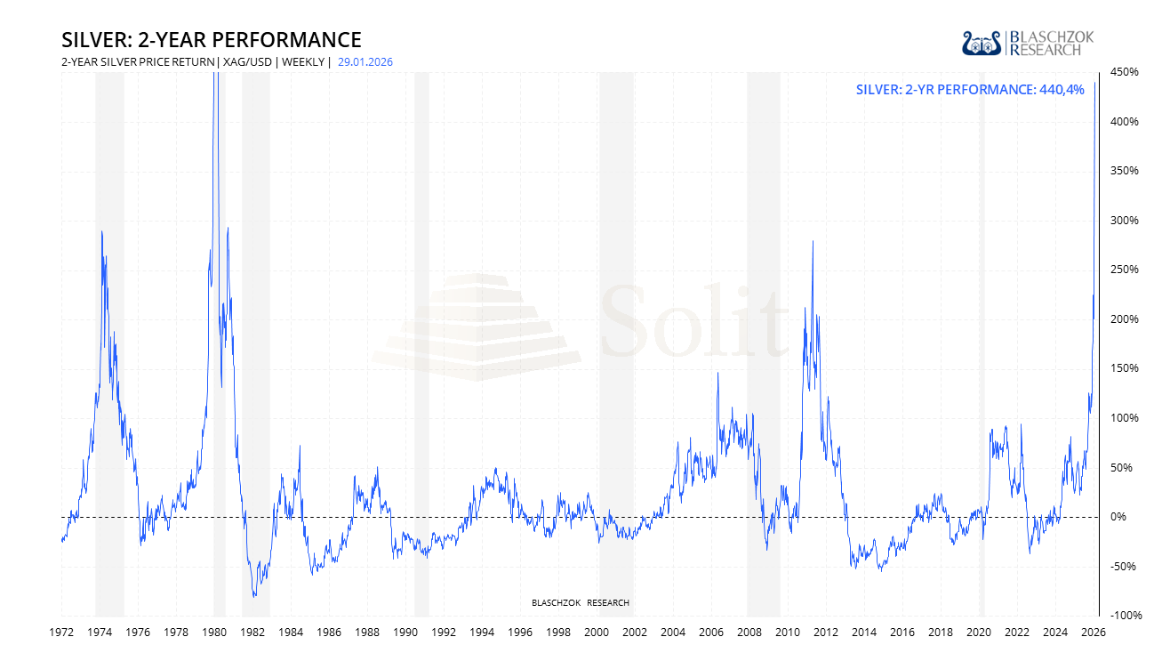 Die Zweijahresrendite von Silber ist mit einem Anstieg von 440 % noch beeindruckender und nähert sich damit dem Niveau der finalen Hausse um 1980. Genau diese Renditehistorie ist zugleich ein Warnsignal, denn auf Phasen extremer Outperformance folgten in der Vergangenheit nicht selten schwächere oder sogar negative Jahre. Das macht deutlich, dass starke Korrekturen jederzeit auftreten können, besonders dann, wenn das makroökonomische Umfeld kippt und Rezessionsrisiken zunehmen. Sollte sich die Konjunktur spürbar abschwächen oder sollten geopolitische Störungen die Risikoneigung belasten, wäre ein deutlicher Rückgang des Silberpreises vorstellbar. Vor diesem Hintergrund ist Demut angebracht und es empfiehlt sich, Gewinne sukzessive abzusichern. Wie man erfolgreich physische Bestände über den Terminmarkt absichert, erfährt man als Premium-Abonnent auf www.blaschzokresearch.de .